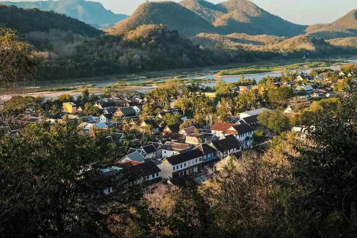 Standing on the top of the mountain, one can gaze out over the city's neatly arranged houses and neatly arranged streets. Dark green coconut trees overshadow the brick-red roofs of Western-style buildings, creating a unique tropical atmosphere. The ancient city lacks tall buildings; instead, it's dominated by temples and one- or two-story buildings, their beautiful spires looming among the dense foliage. From there, one can also see the beautiful Mekong and Nam Khan rivers. The unique tropical atmosphere makes one feel like entering a paradise, a place of tranquility and peace.