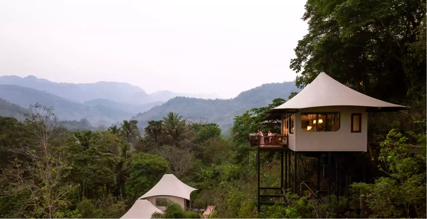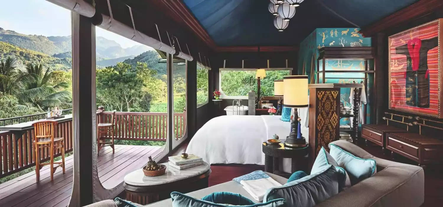 The 75-square-meter luxury tent villas feature a private dining area and wraparound deck. Laotian traditions and French colonial influences are cleverly blended throughout the hotel's design and architecture, evident in the use of indigenous materials and locally inspired artwork.