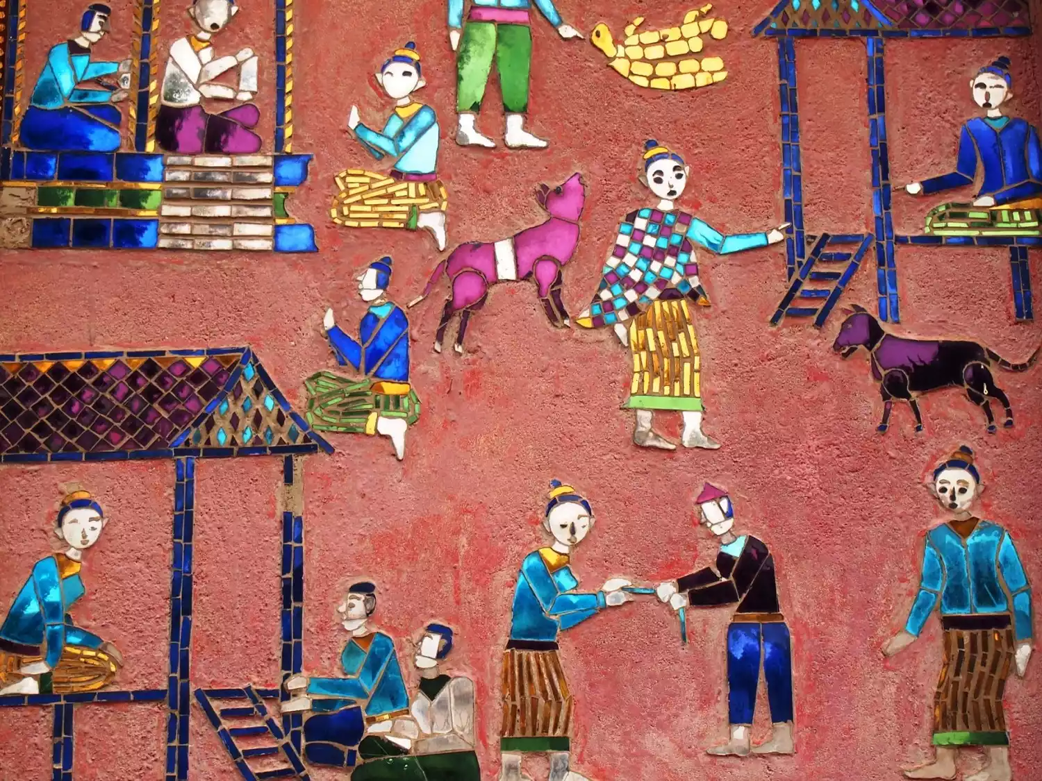 The main hall represents the classic Luang Prabang temple architectural style. The roof covered with a Dharma wheel is supported by ornately decorated wooden pillars. The famous "Tree of Life" on the outer wall of the rear hall attracts many tourists to stop and take a look.