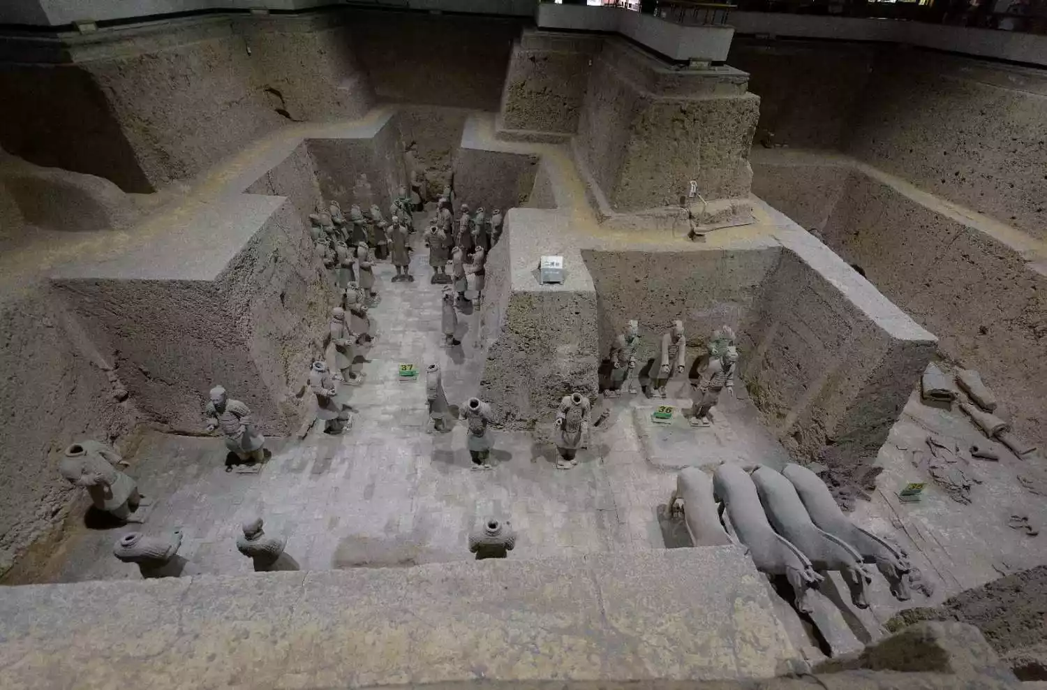The mausoleum was constructed to ensure that Qin Shihuang enjoyed wealth and prosperity even after his death, modeled after the Qin capital of Xianyang, forming a roughly circular U-shaped structure. The remains of large structures discovered within the mausoleum area include the sleeping hall, auxiliary halls, and official residences. Due to limited archaeological technology, excavations have yet to be conducted on Qin Shihuang's tomb. Visitors can only see a towering tomb surrounded by peaks, seamlessly integrated with Mount Li.
