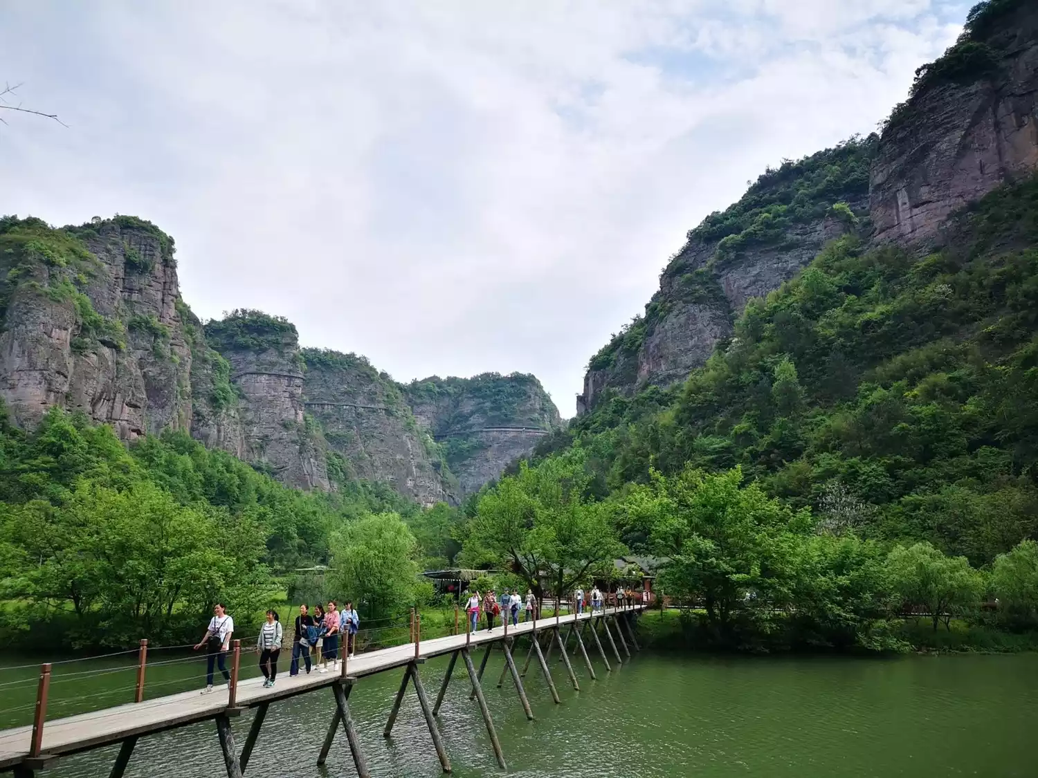 Along the Hanfei River, there is a twenty-mile quiet stream, and the Danxia wind hums softly all the way. There are green mountains and lush trees on both sides, and waterfalls like silk. Walking along the riverside, there is a large canyon sandwiched between the two peaks, which is deep and beautiful.