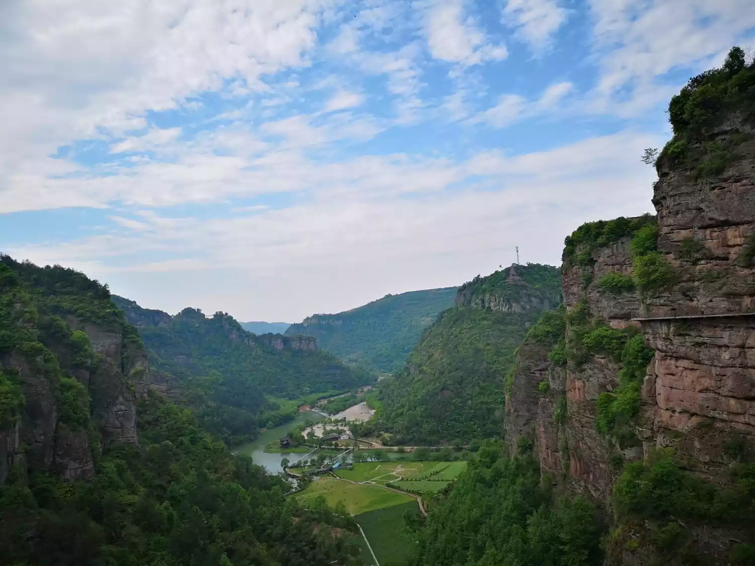 At the bottom of the valley lies the Hanfei River, with Danxia and red rocks all the way, towering cliffs a thousand feet high, surging and undulating. Two peaks are sandwiched between a thousand-foot deep canyon, and the scenery is breathtakingly beautiful.
