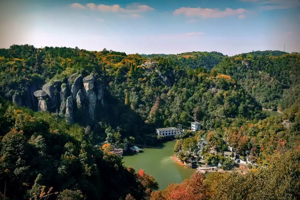 The scenic area is full of peaks, ridges, rocks, ridges, caves, streams, streams, waterfalls, pools and springs, with the scenery of mountains and waters complementing each other. It is famous for its four characteristics: elegance, seclusion, strangeness and danger.