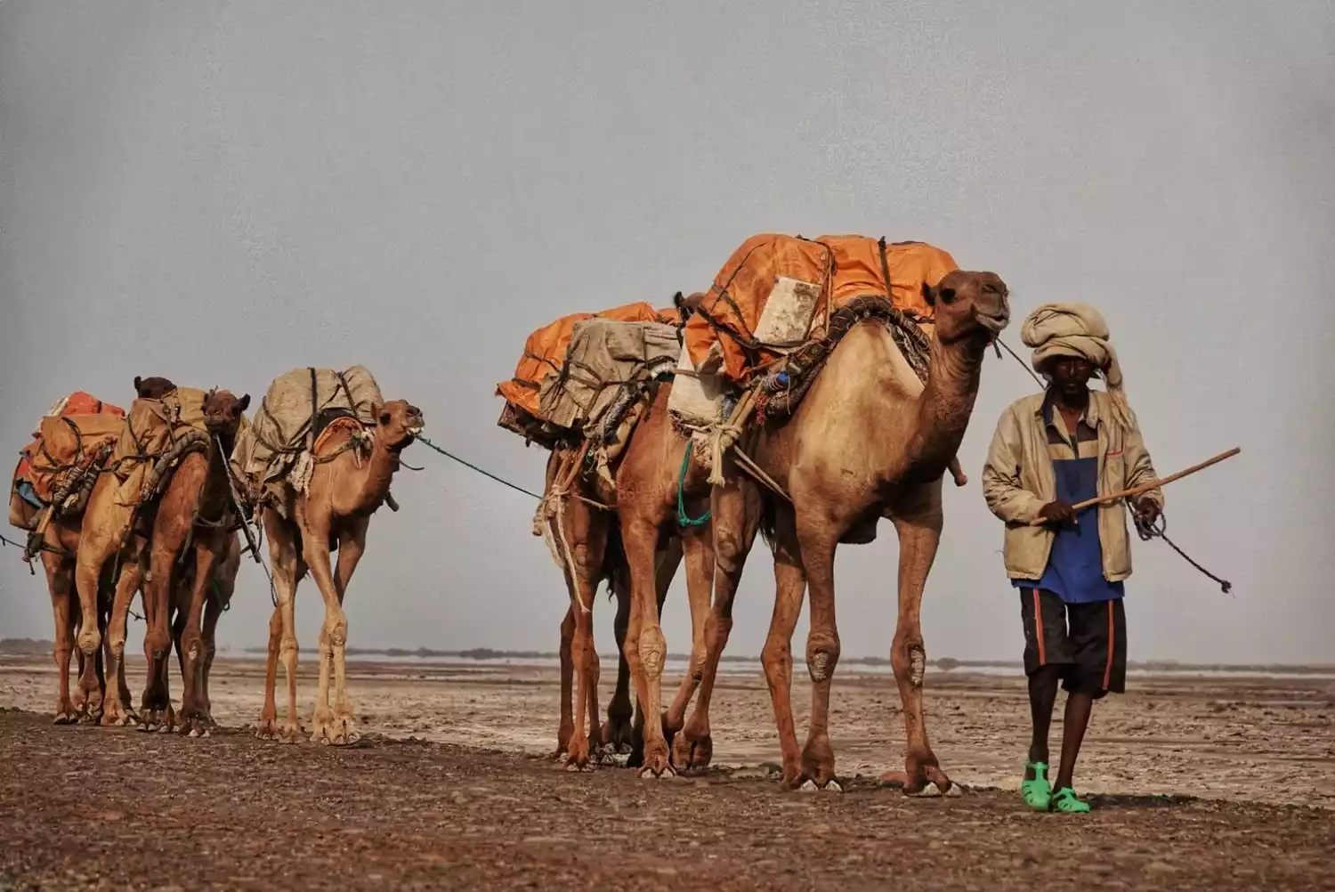 Camels are one of the few animals that can survive in such a harsh environment. On this hiking route, you can see camel caravans going to collect salt or returning from collecting salt.