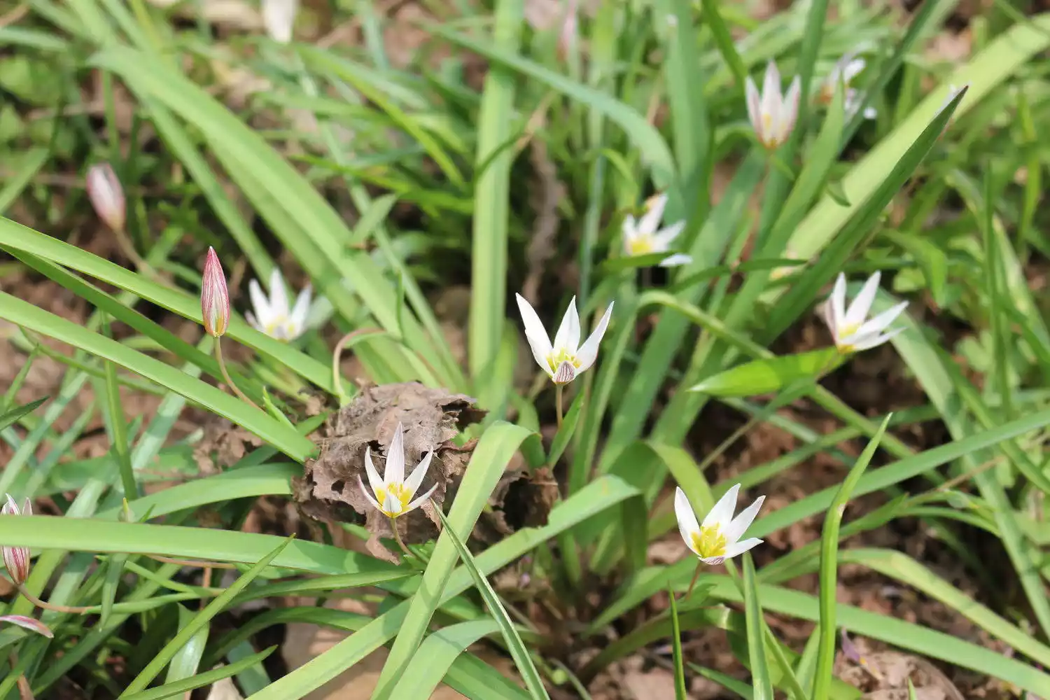 There are shepherd's purse and cardamine with small flowers from the Cruciferae family, chickweed and osmanthus from the Caryophyllaceae family, Arabian speedwell with small blue-purple flowers, the "little tulips" blooming in spring, and duchesnea and cat's claw with small yellow flowers.
