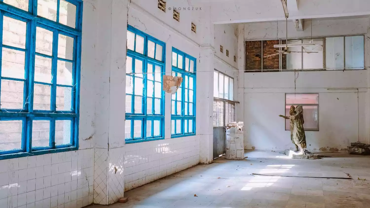Because the area inside is not open to the public yet, it is overgrown with weeds, giving it a dilapidated and desolate beauty. The classrooms and auditorium are still the same as before, as if you can see the scene here decades ago.