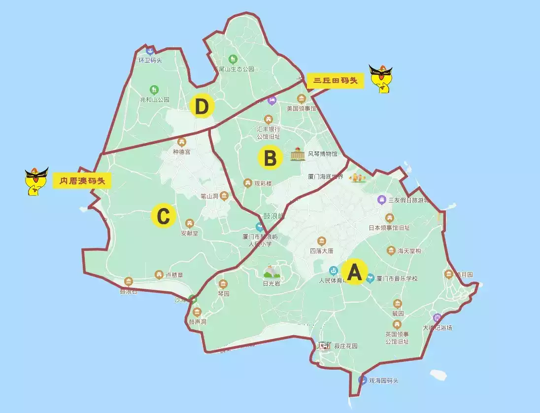 According to my own understanding, I made a division map and divided Gulangyu into four parts: ABCD. The island looks small on the map, but it is almost impossible to check in all the attractions in one day.