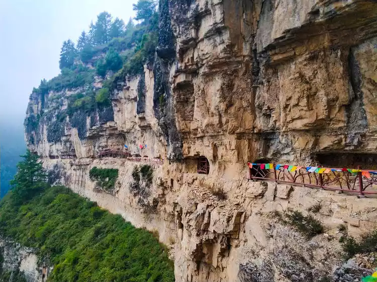 Luya Mountain's most surprising and hidden gem, bar none! Also known as the "Ningwu Cliff Ancient Plank Road," its construction dates back to the Zhenyuan period of the Tang Dynasty. The plank road traverses the cliffs on the sunny side of the canyon, facing a vast forest. Visitors can access the plank road from Xiaoshimen Village, follow the cliffs, cross the cable suspension bridge, and then continue along the plank road, passing the swinging columns to enter the Hanging Temple and the Immortal Cave. Then, pass the caves housing the hanging coffins, pass the Dragon King Temple, and finally descend to the valley floor alongside the hanging coffins.