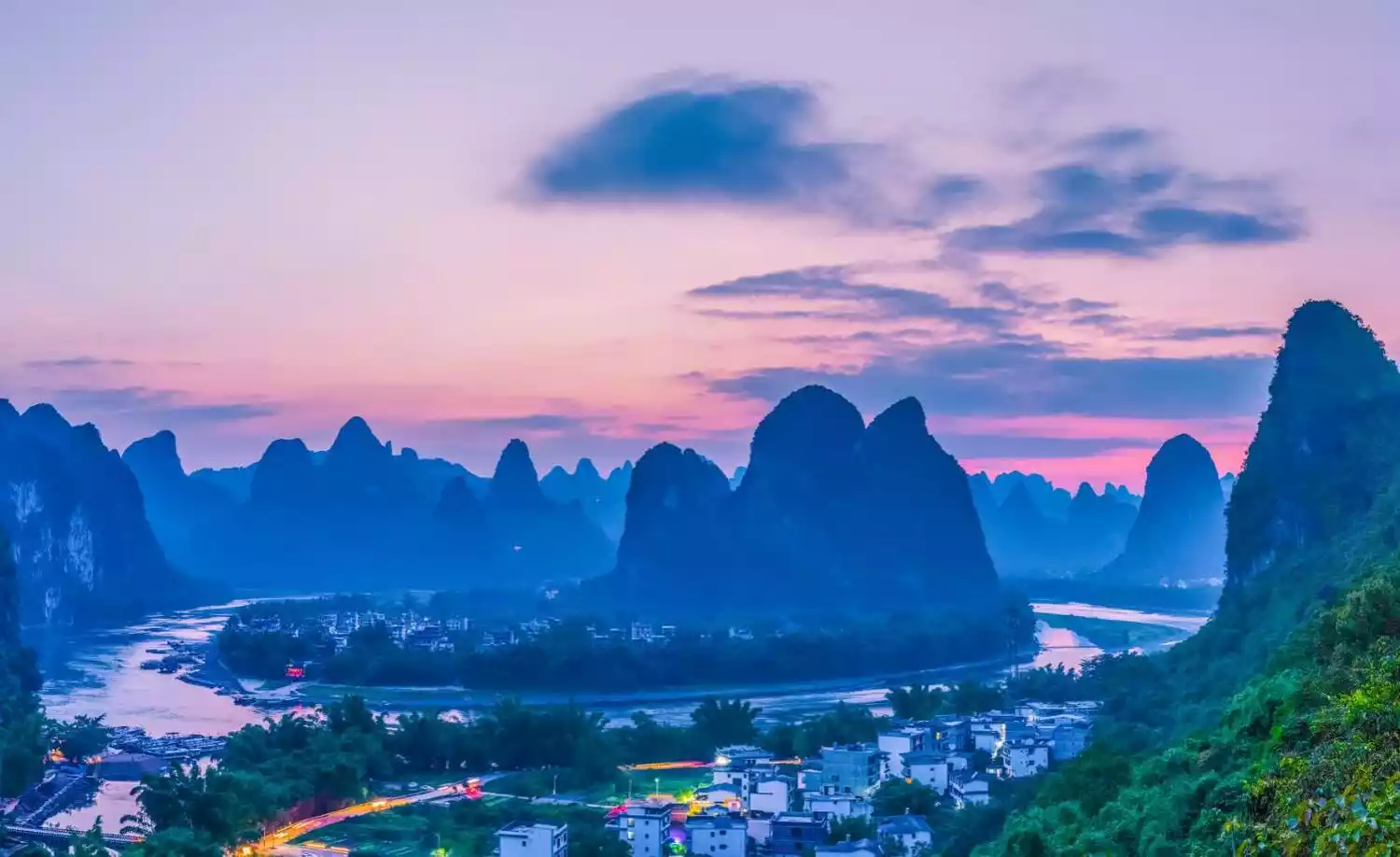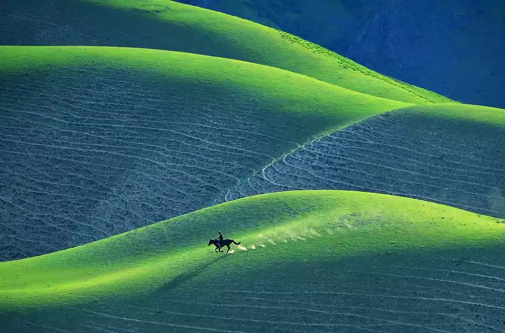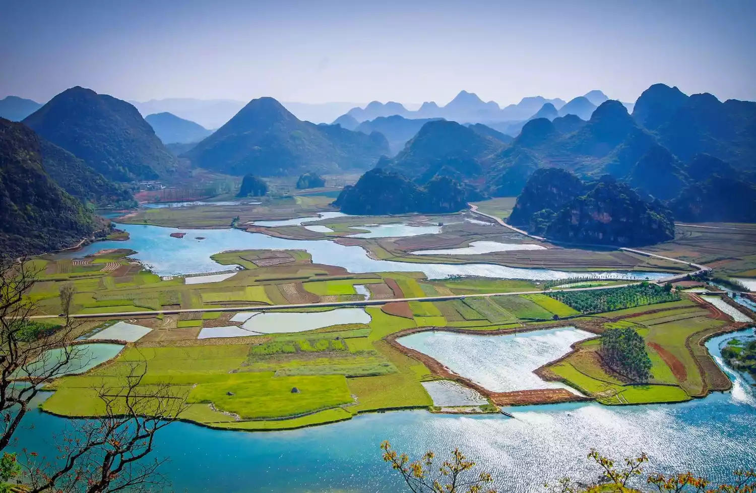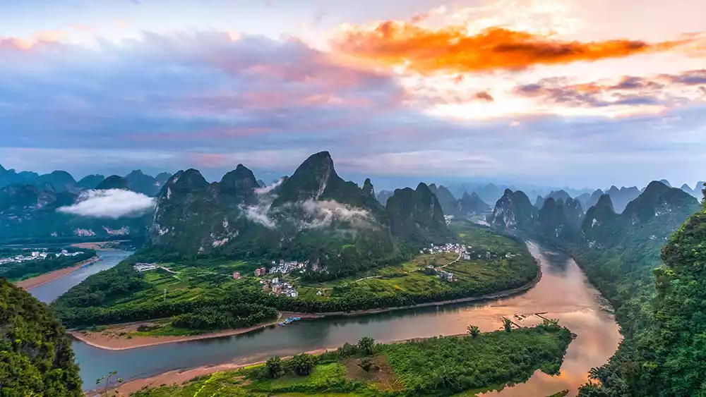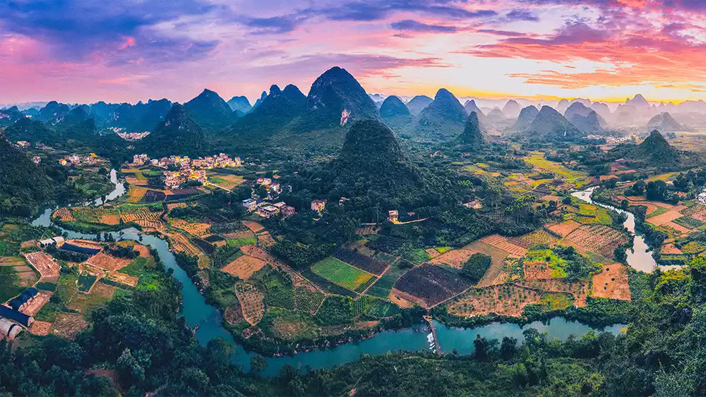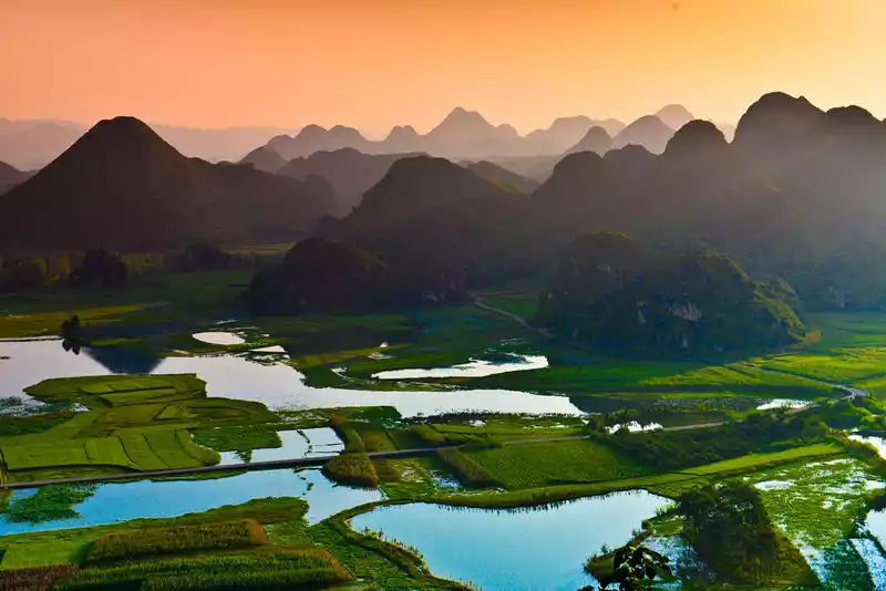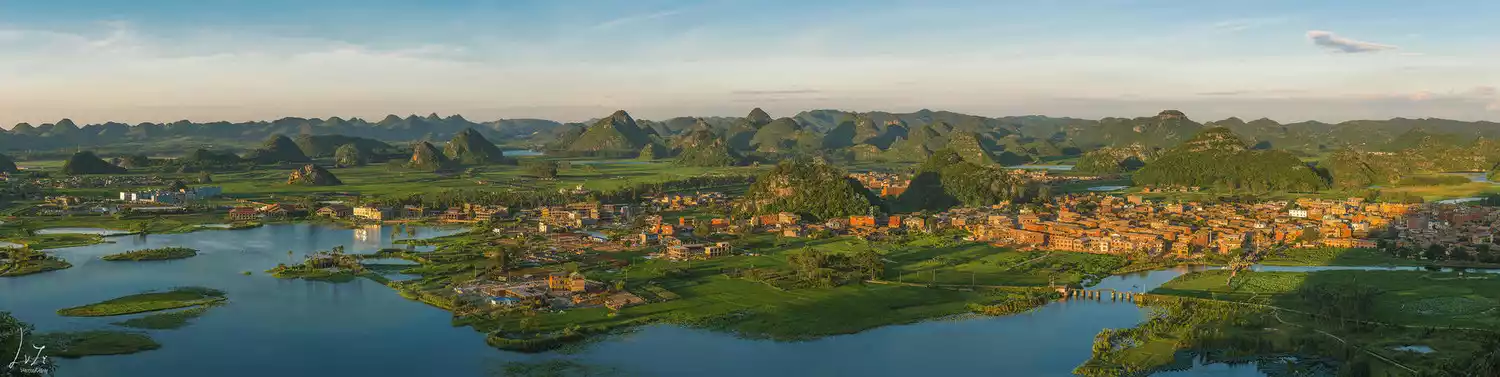 There are more than 300 isolated peaks in Puzhehei, some standing in the lakes, some sitting on the plains. Looking at the panoramic view, the mountains look like thousands of galloping horses.