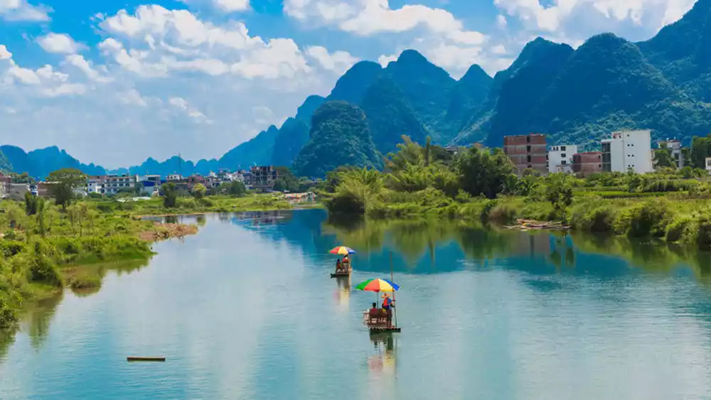 Xianrendong Village is surrounded by green mountains and vast blue waters, creating a beautiful environment. Today, it is also the busiest place in the Puzhehei Scenic Area, with many delicious restaurants, inns, hotels, and shopping opportunities, making it a great place to spend the night.