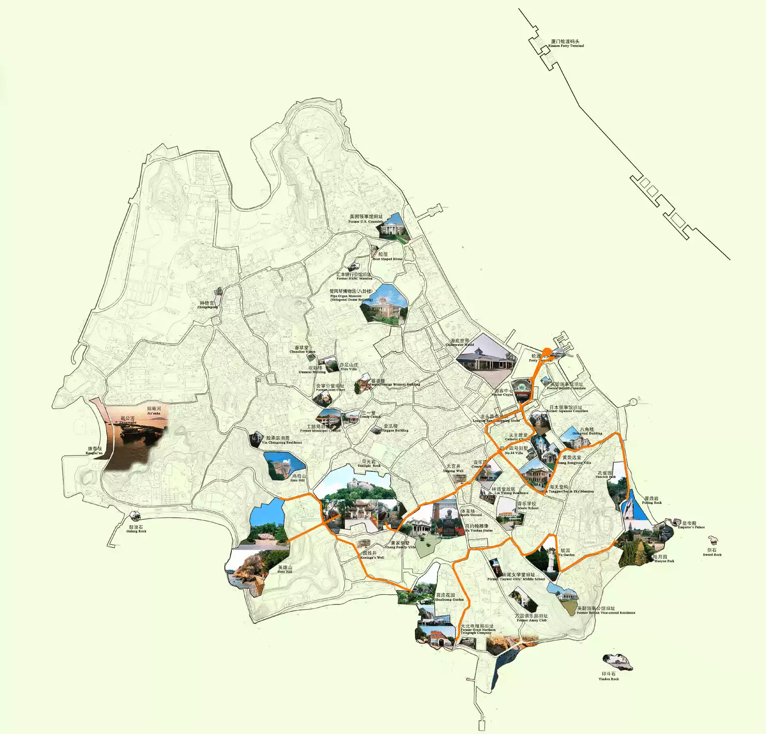 三丘田码头 → 八卦楼 → 东方鱼骨艺术馆 → 三一堂 → 黄赐敏别墅/金瓜楼 → 林语堂故居 → 海天堂构 → 黄荣远堂 → 世界名人蜡像馆 → 钢琴码头