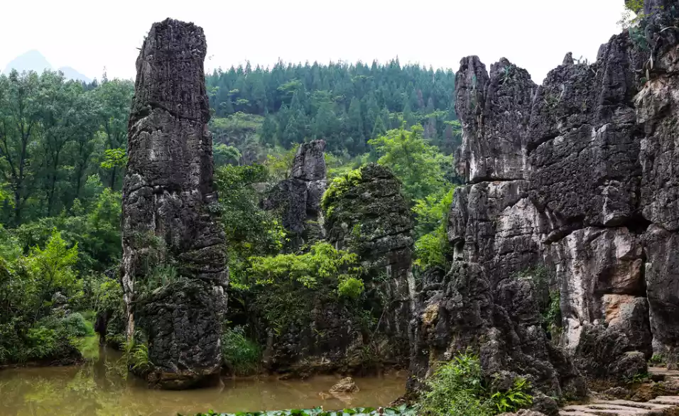 The Tianxing Bridge Scenic Area is 6 kilometers downstream of the Huangguoshu Waterfall and consists of three connected forest areas, namely the Tianxing Bonsai Area, the Tianxing Cave Scenic Area, and the Water Stone Forest Area.
