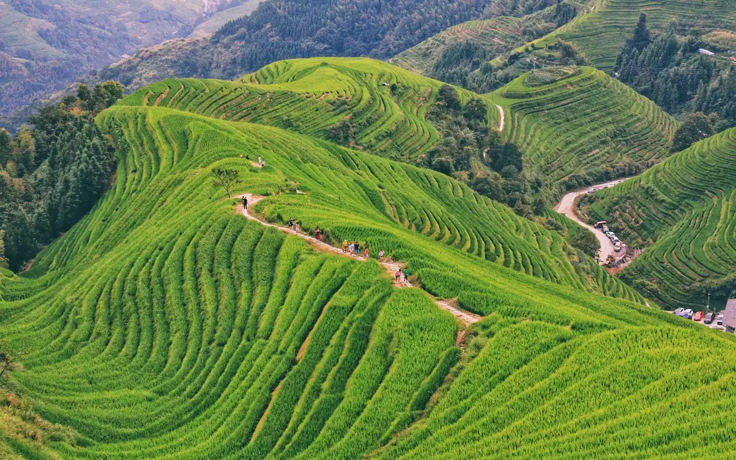 The magnificent lines extend infinitely, embracing the ancient Zhuang village and pine and fir forests. Due to the high altitude of the terraced fields, the temperature is naturally 2-3 degrees lower than that in the city during the night stay, but it is still inevitable to feel hot while climbing the mountain at noon.