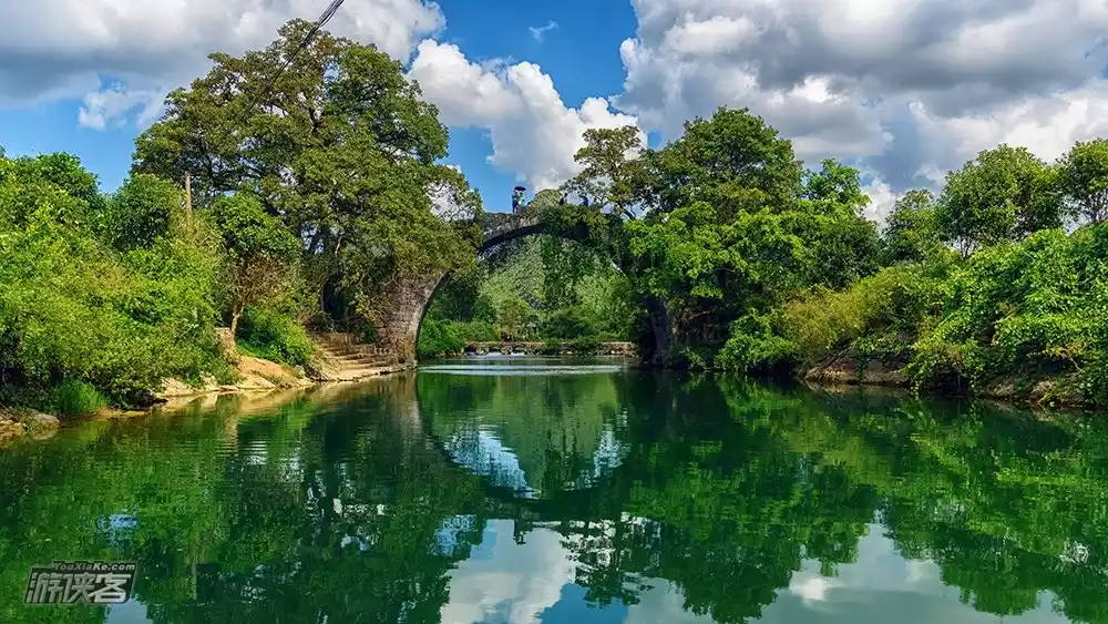 Yulong Bridge, a locally protected cultural relic with over 600 years of history, is a short walk across the bridge, offering a sense of history. The quaint bridge is entwined with vines, and the ancient camphor trees on both sides are still in full bloom. The bustling crowds of tourists might even make you feel like you've traveled back to the Ming Dynasty in Guangxi.