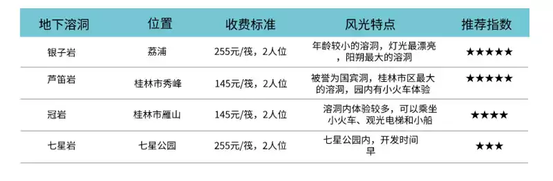 In addition to Silver Cave, Guilin also has other caves to choose from, such as Reed Flute Cave, Crown Cave, and Seven Star Cave. It is also very pleasant to play in any of them. I have made a comparison chart for everyone, so you can choose the corresponding cave according to your travel needs.