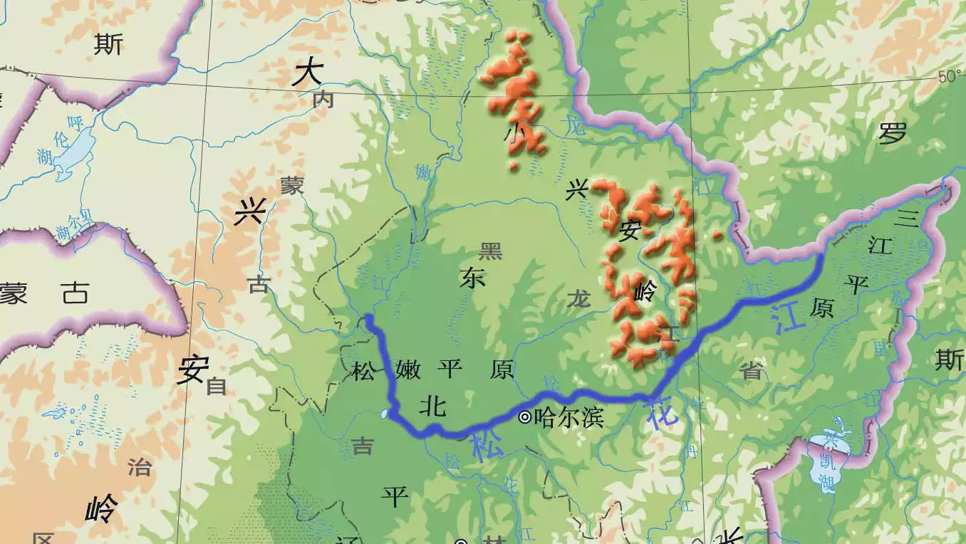 The Lesser Khingan Mountains are surrounded by the Heilongjiang, Songhuajiang, and Nenjiang rivers. It is the watershed between the Heilongjiang and Nenjiang rivers, with the Songhua River flowing slowly along its southern slopes.
