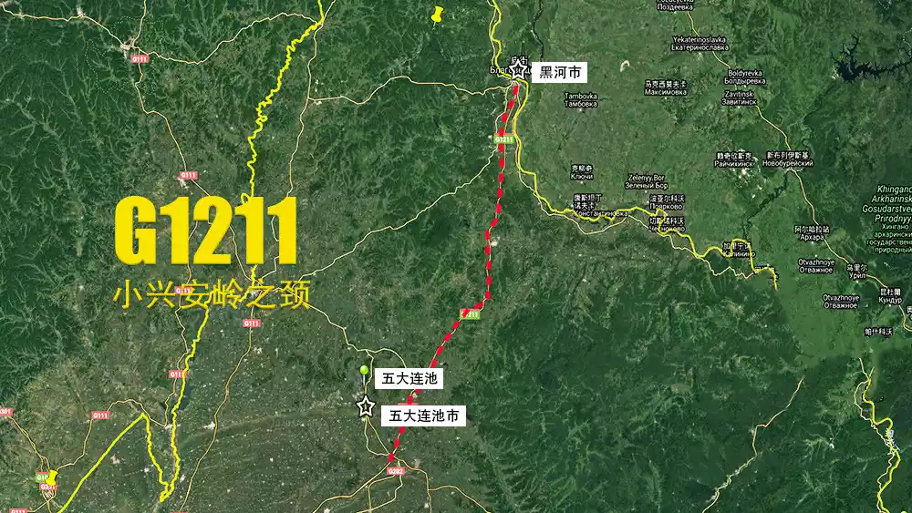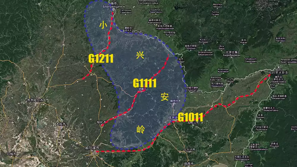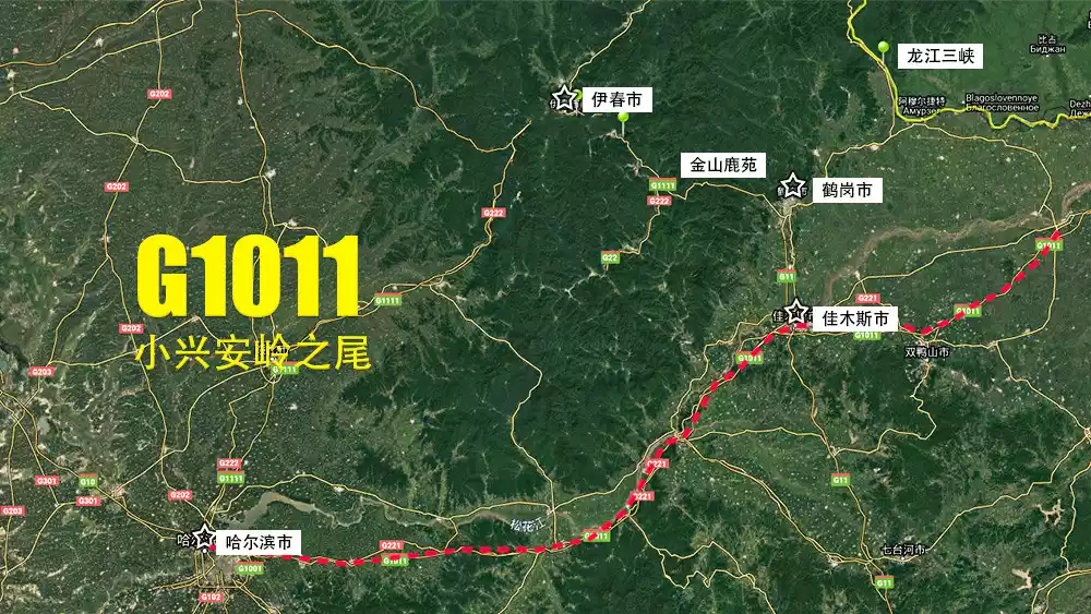 G1011 runs parallel to the Songhua River eastward, passing Jiamusi and Hegang, and then to Fuyuan. South of the Songhua River is the Changbai Mountain area.