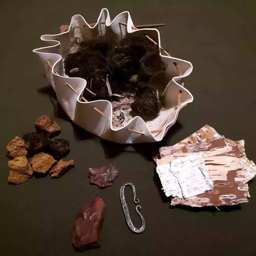 Bushcrafters often keep a fire box, a small, sealed device for making fire. It typically contains flint, matches, a steel steel, charcoal cloth, and a candle. More sophisticated fire starters, such as a mixture of wax and sawdust, can burn even in rainwater and last a long time.
