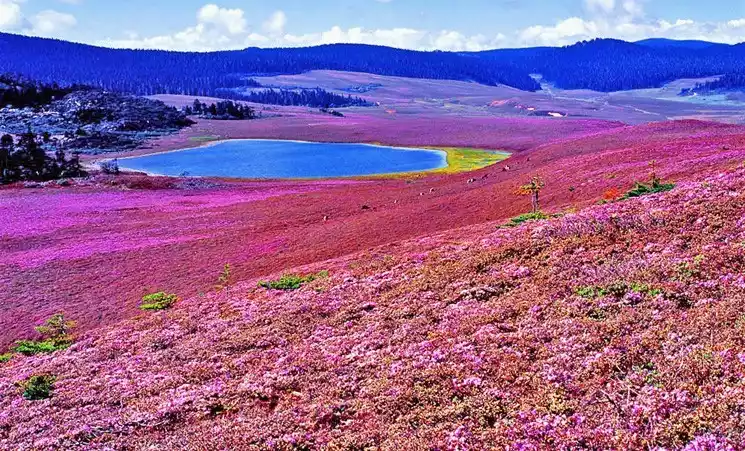 The edge of the forest is lined with large rhododendrons, with large, vibrant corollas, while the lakeside is lined with dwarf rhododendrons, forming a stunning purple-red carpet.