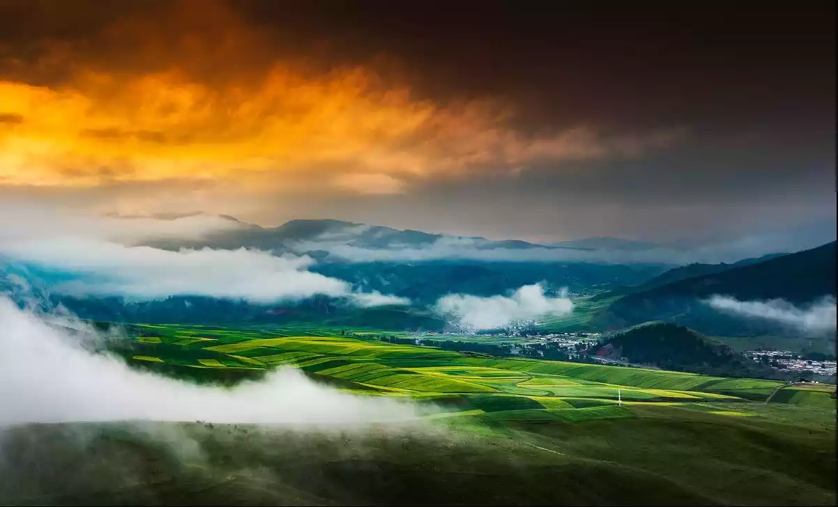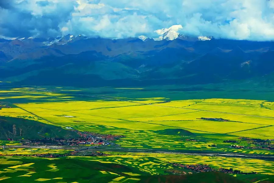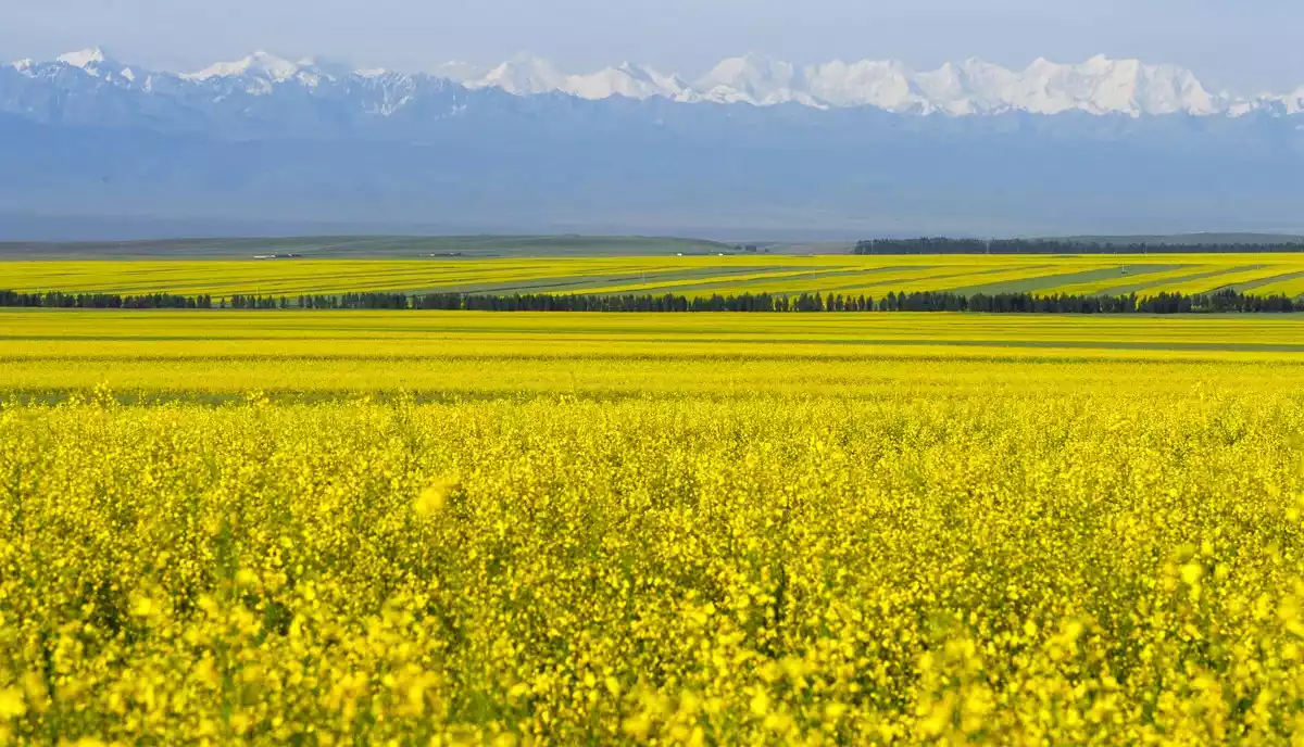 When you arrive in Menyuan, stand on a commanding height and overlook the endless sea of rapeseed flowers with the majestic Qilian Snow Mountain in the background, accompanied by emerald green barley, ancient mosques, and villages dotted among them. The scene is so beautiful that it is beyond words.
