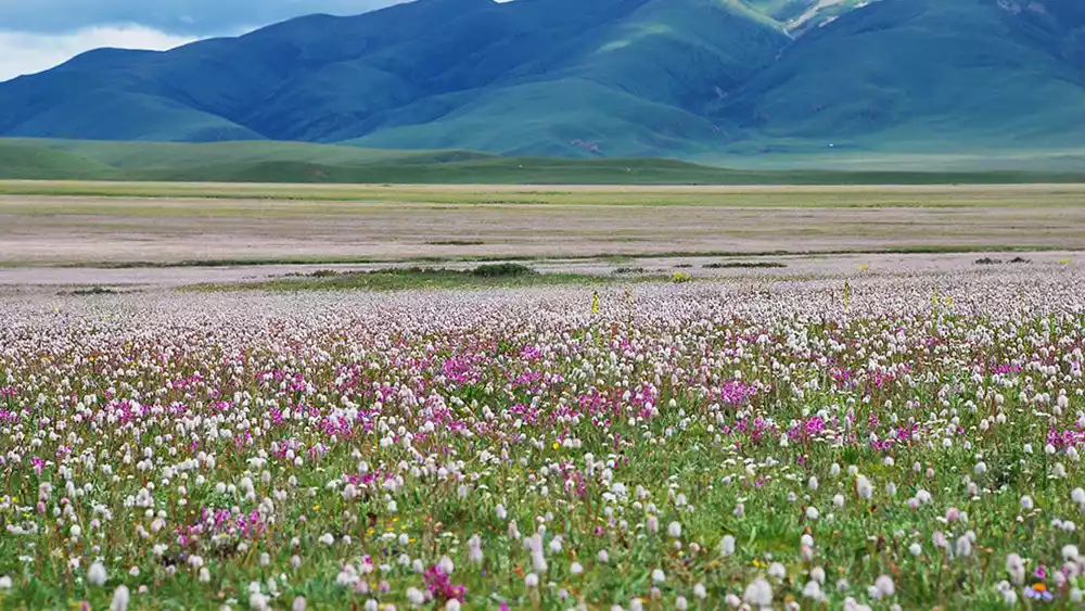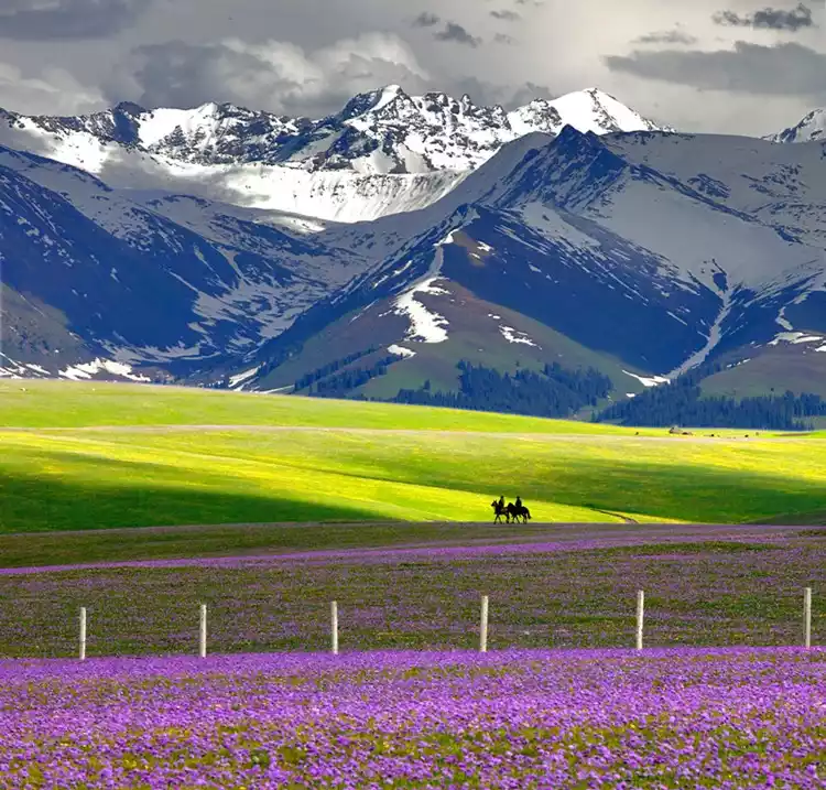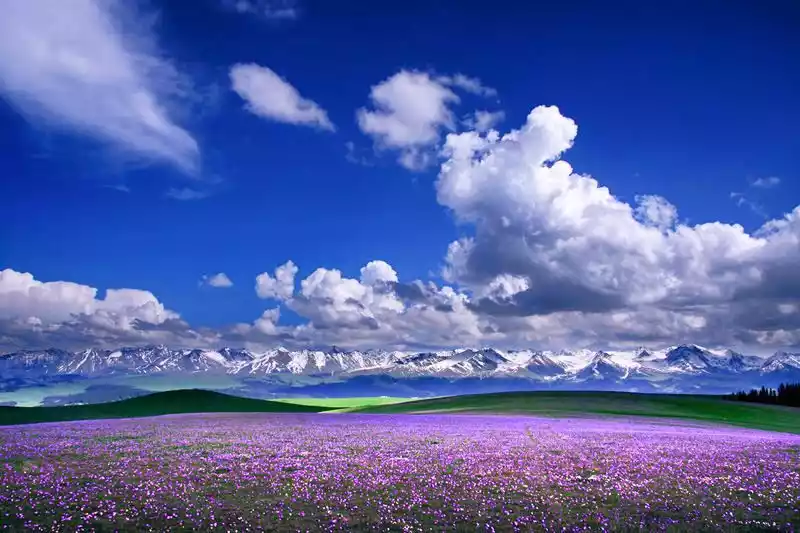 The bright little flowers, the azure sky, the towering snow-capped peaks and the vast grassland complement each other, making people fascinated.