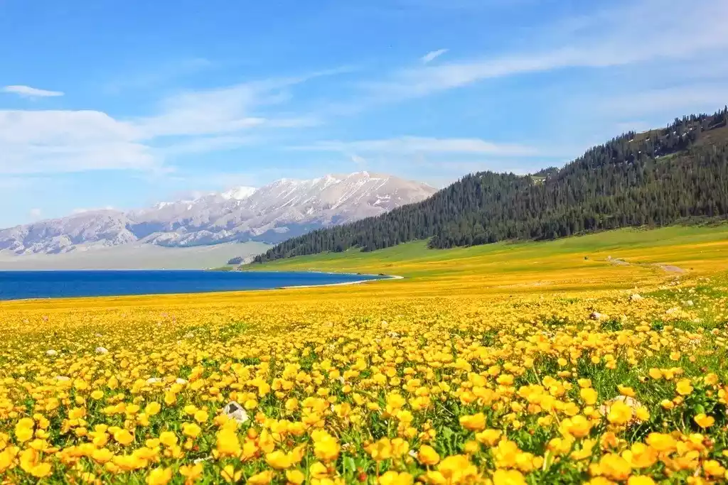 Starting from mid-to-late May every year, wild tulips, nasturtiums, giant nasturtiums, forget-me-nots, irises and other flowers with regional characteristics bloom one after another around the azure Sailimu Lake.