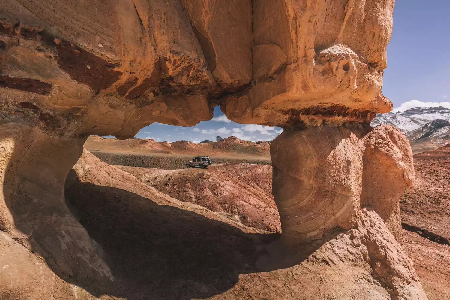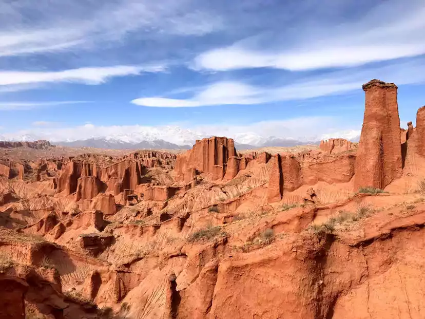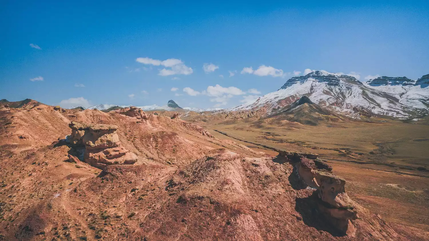The Red Valley, located on the border between China and Kyrgyzstan, features a wondrous blend of Danxia landforms, snow-capped mountains, and grasslands, shaped by weathering into a diverse array of forms. These include "Skull Mountain," which resembles a skull, "Hat Mountain," shaped like a magic hat, and various red weathered rocks. Off-road vehicles can navigate this terrain, allowing visitors to explore the Danxia Valley, ascend to its summit, and marvel at the wonders of nature.