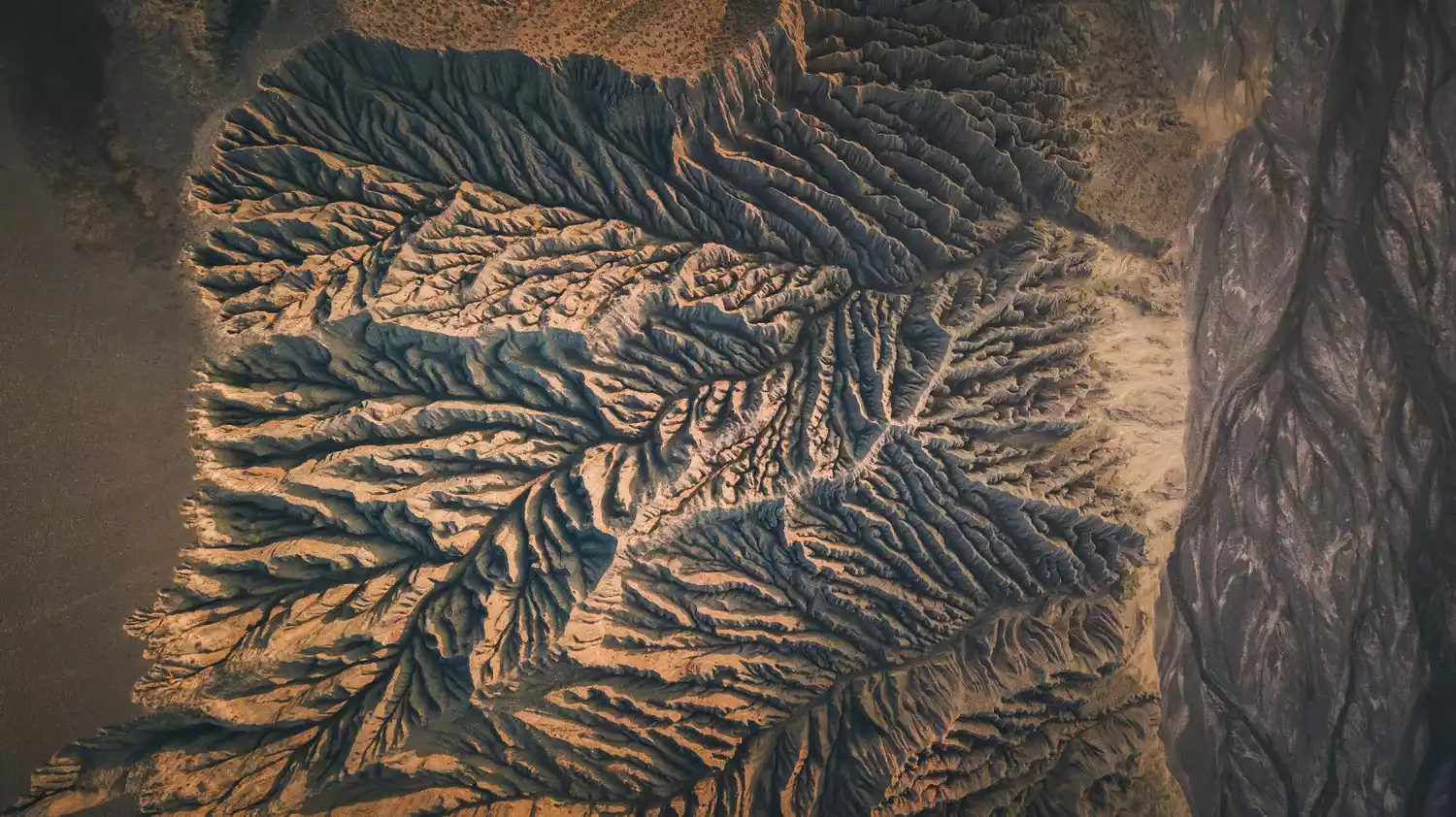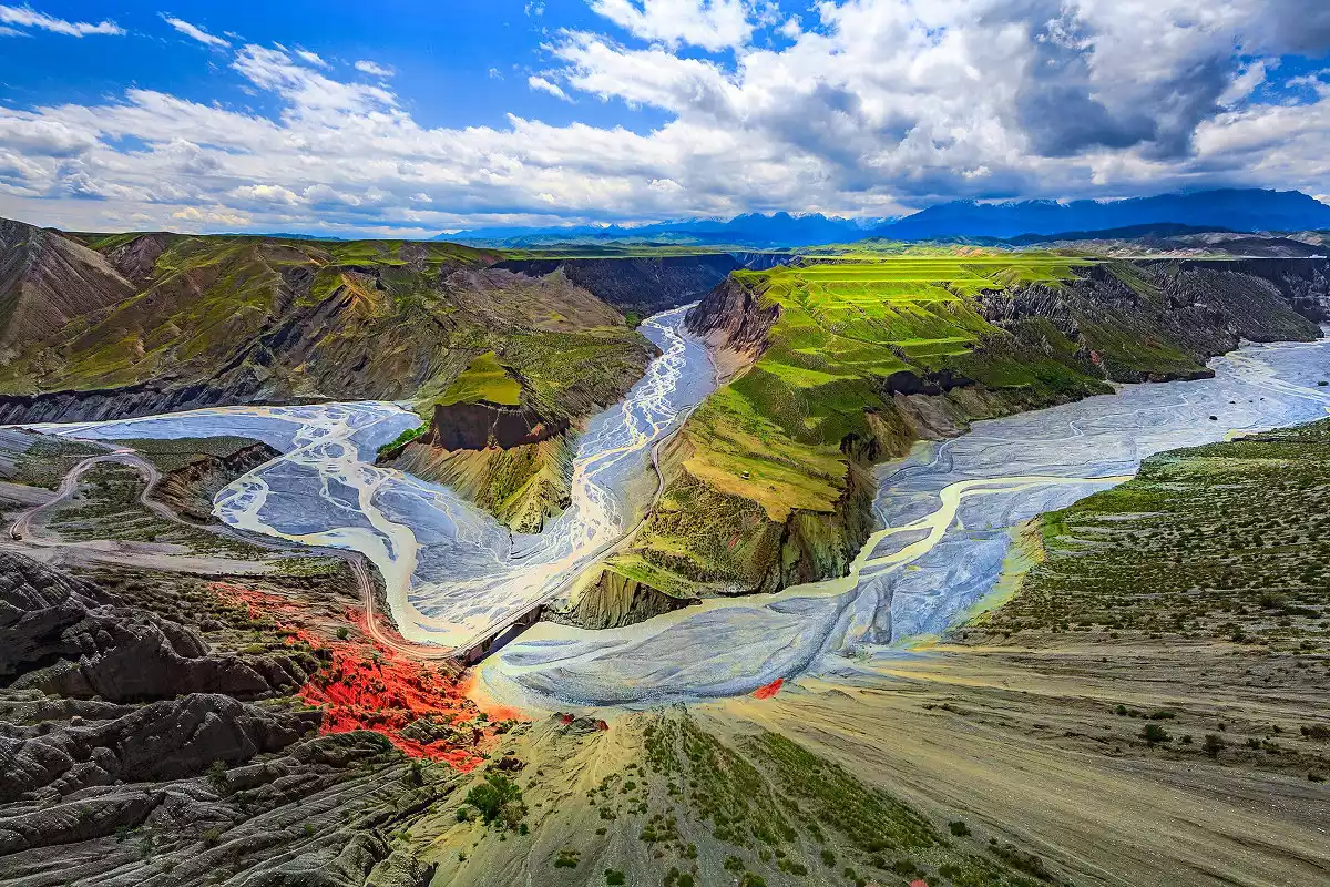Across the endless grasslands, a 230-meter-deep rift suddenly appears (I measured the depth using a drone). This spectacular canyon, formed by the relentless erosion of meltwater from the Tianshan glaciers, features a crisscross of gullies stretching from the rim to the valley floor. The rich mineral deposits in the soil give the mountain a reddish-brown and grayish-brown hue, earning it the name Hongshan Grand Canyon.
