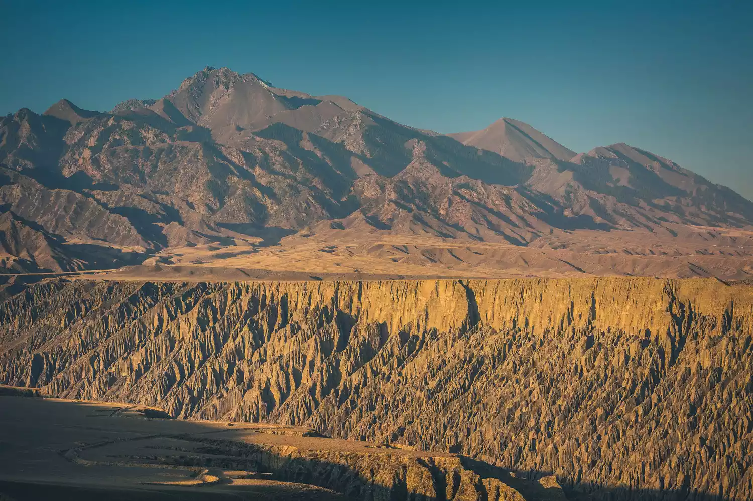 You should go to Dushanzi Grand Canyon early in the morning because you need to shoot from a direct sunlight angle. When the sun comes out in the morning, the sunlight hitting the cliff will create a very layered contrast. There are also the Tianshan Snow Mountain in the distance.
