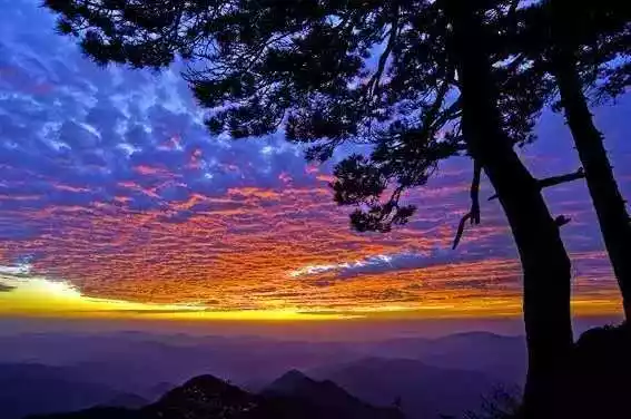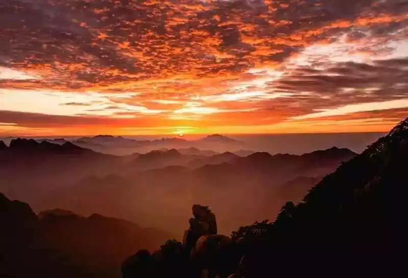 As the sea of clouds rises, the orange sun jumps out from the sea of clouds. As time passes, the sky and the earth gradually brighten. In the distance, a purple-red dot slowly rises above the line of clouds. The red glow dyes the world so beautifully.