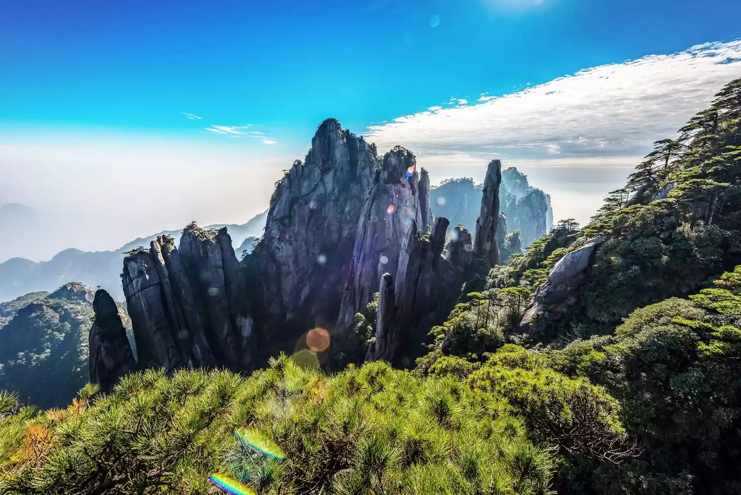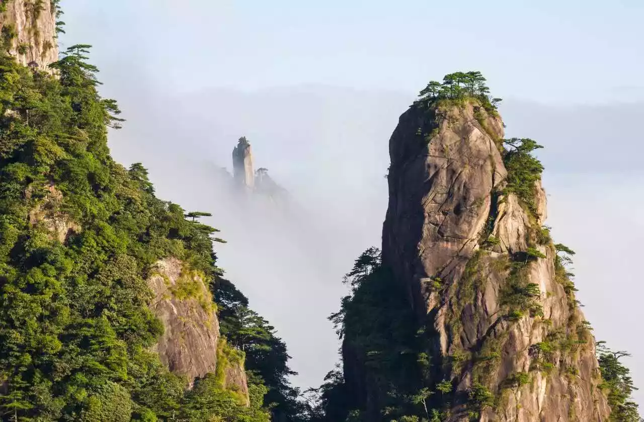 The granite peak forest micro-geomorphology of Sanqingshan Mountain mainly includes nine types: peaks, peak walls, peak clusters, stone forests, peak pillars, stone cones, rock walls, canyons, and shaped stone landscapes. Within the 3,780-hectare core scenic area, there are 48 unique peaks, 89 shaped rocks, and more than 384 scenic spots and landscapes, making it a natural museum of granite micro-geomorphology.