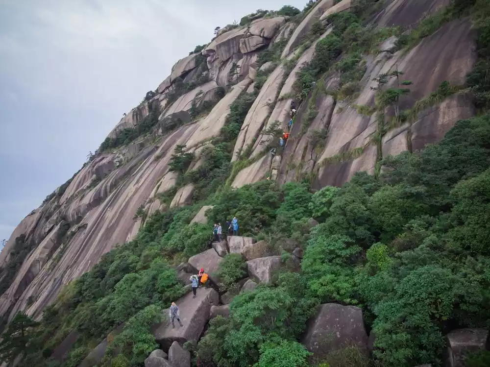 Because the rocks here are primarily natural granite, with a rough, grainy surface and strong friction, even with a steep incline, most people can easily stand on them and climb.