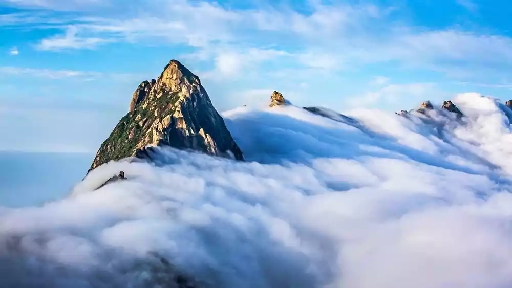 The summit of Dongtai Peak is composed of several massive granite blocks. From the summit, you can overlook other mountains, and in both directions, you'll see a winding, undulating formation of giant rocks stretching into the sky.
