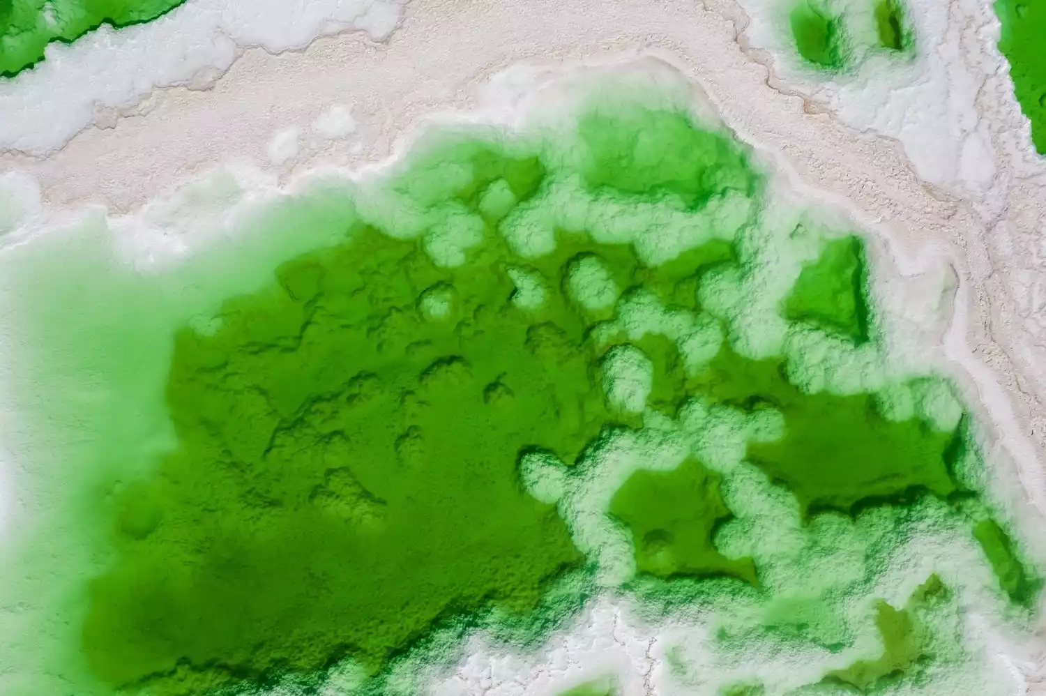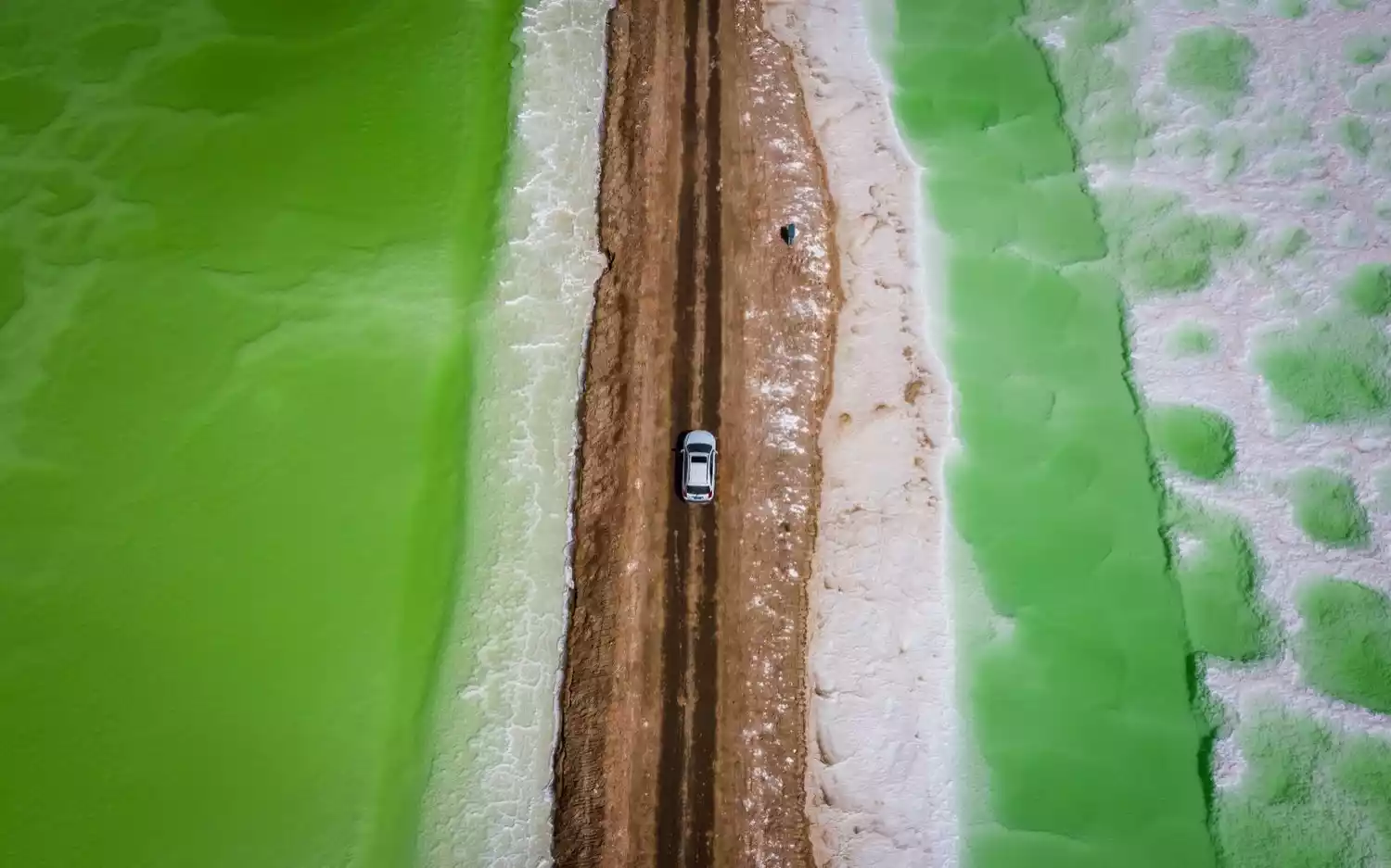 The lake's high copper content gives it a vibrant green hue, while the shores are covered in white crystals. Surrounding the lake are vast expanses of Yardang landforms, including the famous "Water Yardang," which, combined with the vibrant green water, resemble a majestic fleet from afar.