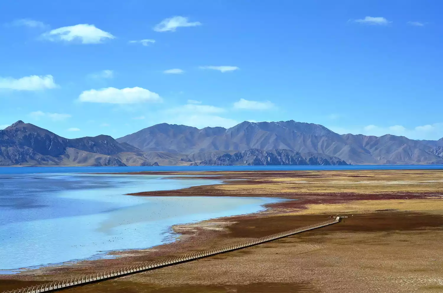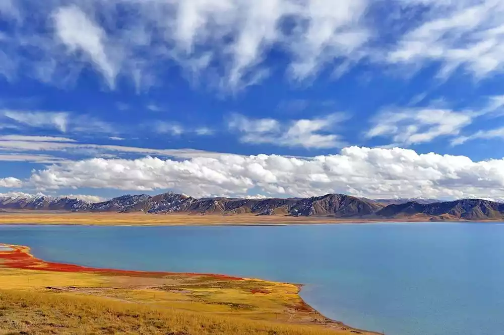 Snow-capped mountains, wetlands, grasslands, emerald lakes, and wildlife all combine beautifully here. The most striking sight is the red grasslands in August and September, when vast expanses of wetland and grassland near the lake turn red, adding to the beauty of the winter lake.