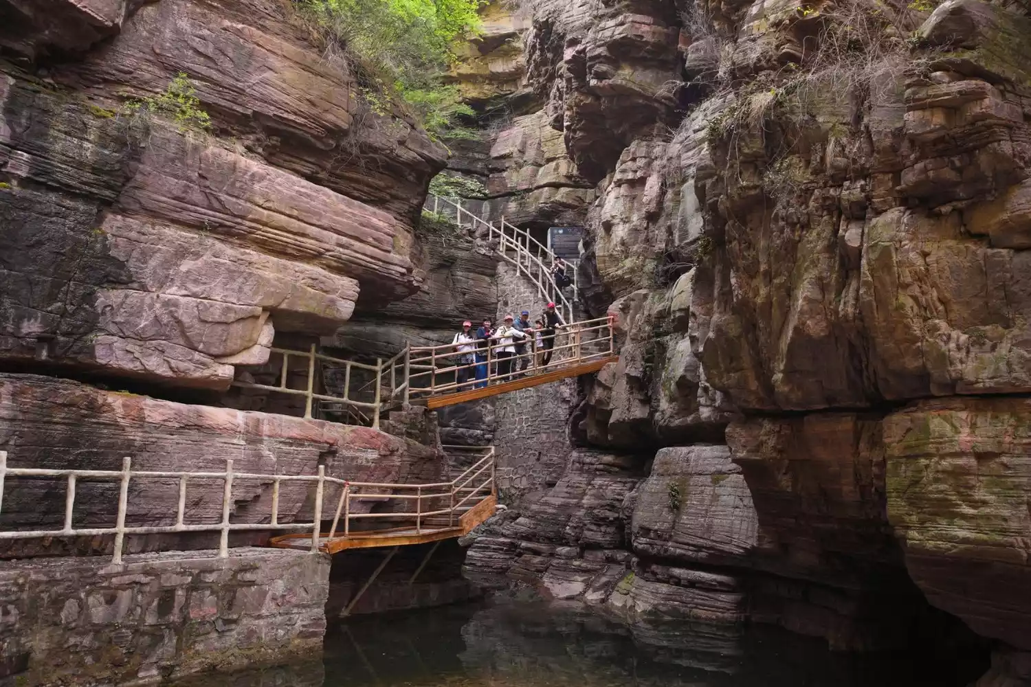 Danfengou is an "ancient road from 1.2 billion years ago". On both sides of the ancient road are towering red rock cliffs. The plank road follows the terrain of the mountain. Sometimes it is a flat wooden plank road, and sometimes it is a straight up and down iron ladder. The majestic Black Dragon Pond Waterfall is also a highlight.