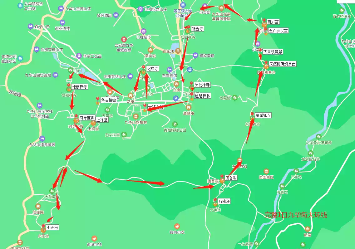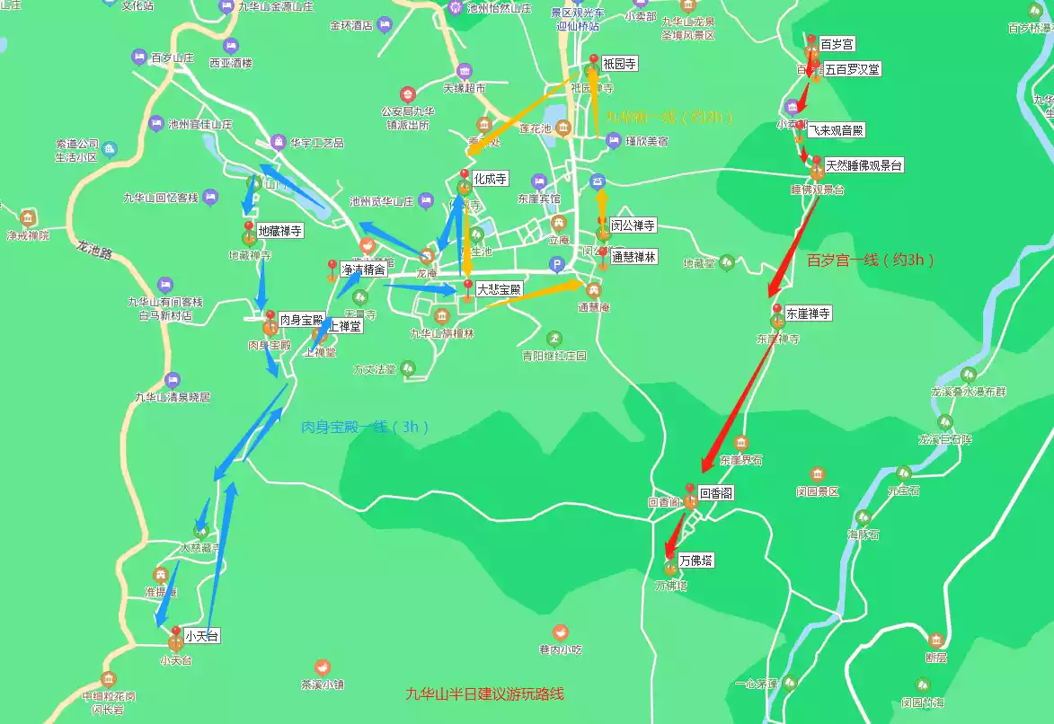(1) Along Jiuhua Street: No need to climb mountains, including Huacheng Temple, Jiyuan Temple, Sandalwood Forest (Dabei Tower), Tonghui Zen Forest, etc., about 3-4 hours