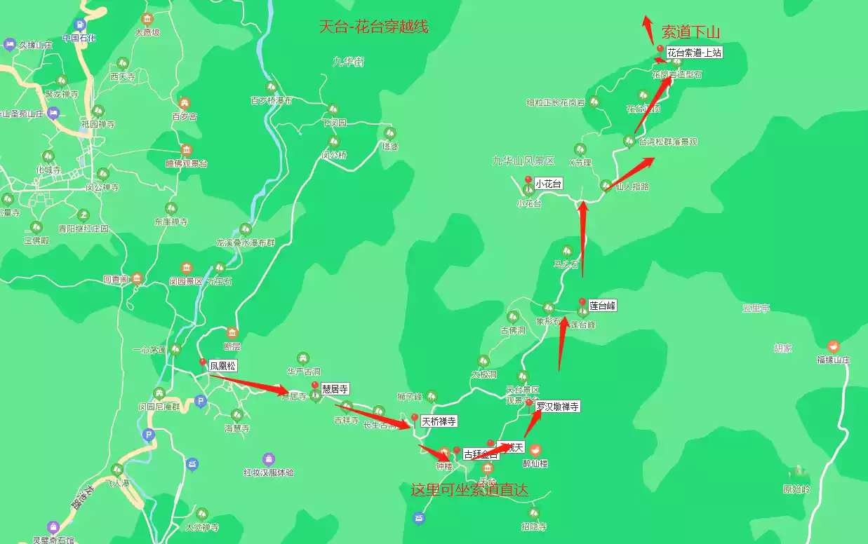 Starting from Jiuhua Street, take the scenic bus to Fenghuangsong, hike or take the cable car to Tiantai Peak, take the mountaintop small loop, visit Taiji Cave, visit Lion Peak, and then go down the mountain to Jiuhua Street.