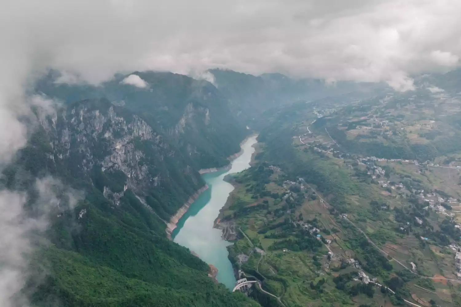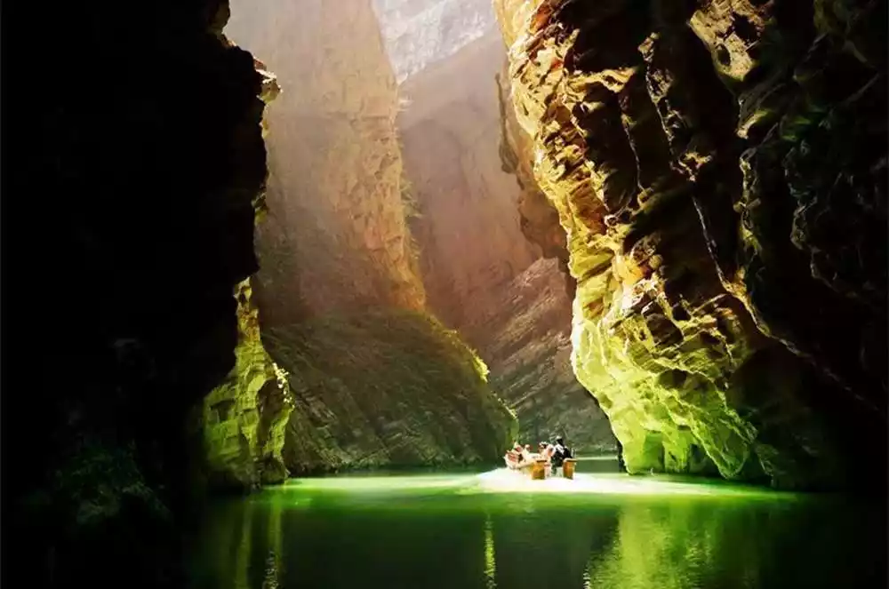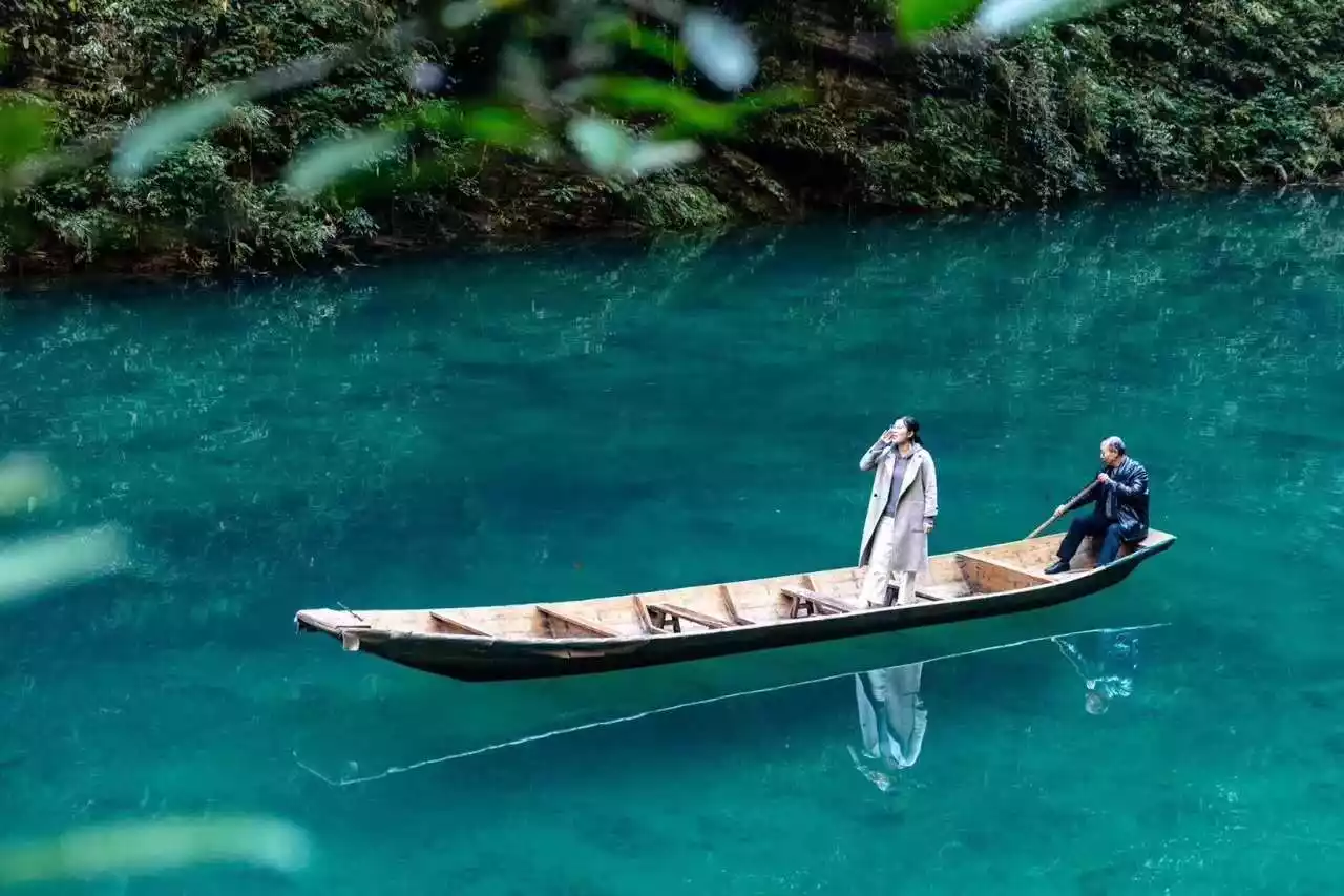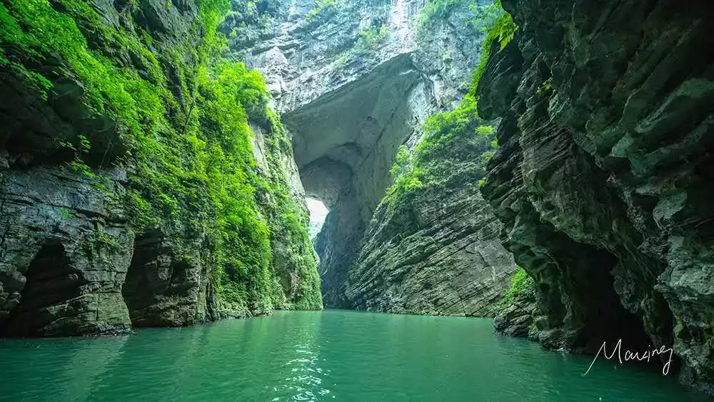 The Pingshan Gorge is over a hundred feet deep, and the water is crystal clear. On a clear day, sunlight reflects off the water, and boats sailing above it appear to be suspended in mid-air.