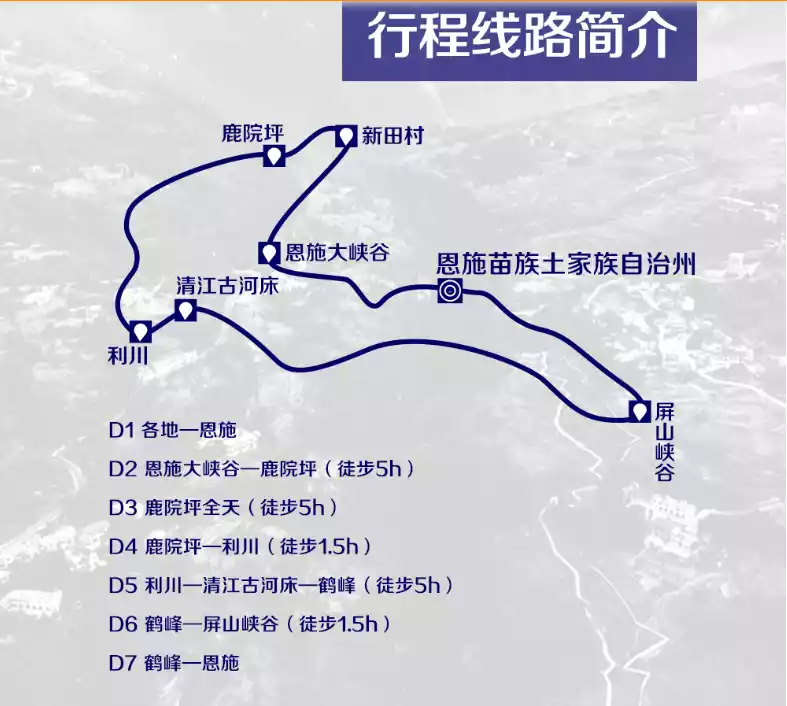 The first day is the gathering day. If you have enough time, we recommend you to visit [Tusi City] and [Daughter City], or try Enshi’s local specialties such as Zhangguanhezha, kangyangya, oil tea soup, Gongpobing, bean skin, etc.