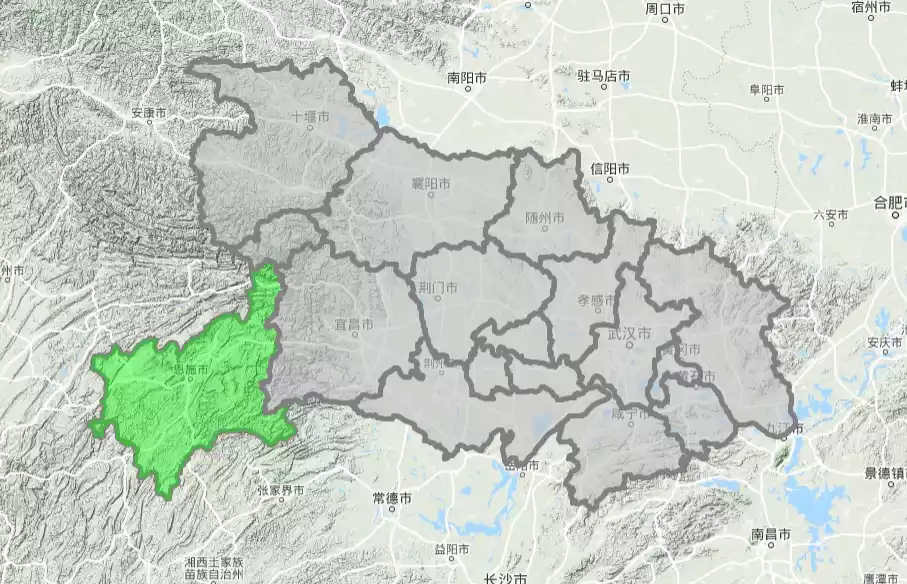 Enshi Prefecture is located in southwestern Hubei Province, at the intersection of Hunan, Hubei, and Chongqing. It borders Qianjiang District of Chongqing to the west, Wanzhou District of Chongqing to the north, Xiangxi Tujia and Miao Autonomous Prefecture of Hunan to the south, Shennongjia Forest District of Hubei Province to the northeast, and Yichang City of Hubei Province to the east. The prefecture stretches approximately 220 kilometers from east to west and 260 kilometers from north to south.