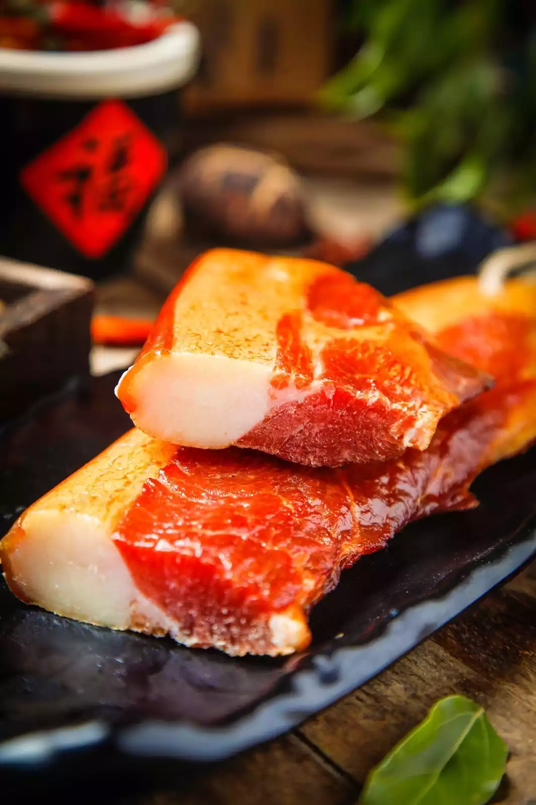 A piece of perfect bacon, after the outer skin is washed clean, the cross section is an attractive meat red, with the smoky salty aroma settled on it, fat but not greasy, and extremely delicious.