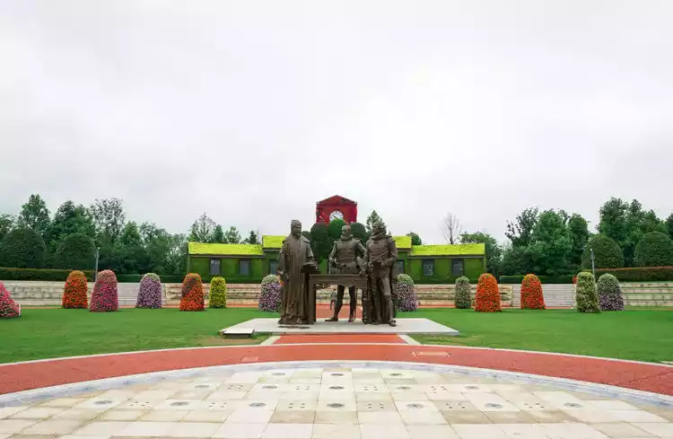 Continuing forward, we arrived at the last part of Sanweng Garden, Sanweng Square. In fact, we went in the wrong direction. This is the entrance to Sanweng Garden. Why it is called Sanweng Garden can be explained here. There are three huge human statues in the square. The three Wengs refer to Tang Weng, Shakespeare, and Sai Weng, who are Tang Xianzu of China, Shakespeare of Britain, and Cervantes of Spain respectively. This is a fusion of Chinese and Western cultures, and it also conveys a concept, so different Chinese and Western styles can be found everywhere in the park.