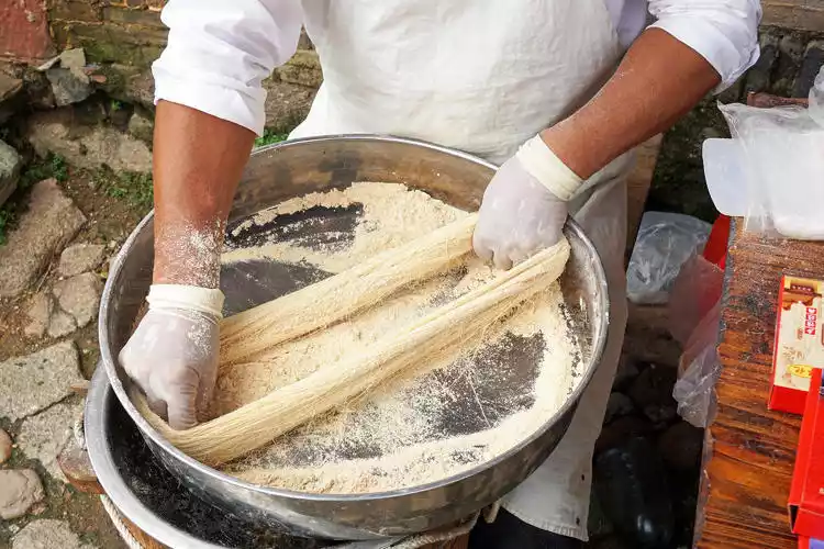 The snack in the ancient village, lotus root candy, looks similar to dragon beard pastry, but there are still some differences. In terms of color, dragon beard pastry is white, while lotus root candy is light yellow. In terms of taste, lotus root candy is not as sticky as dragon beard pastry.