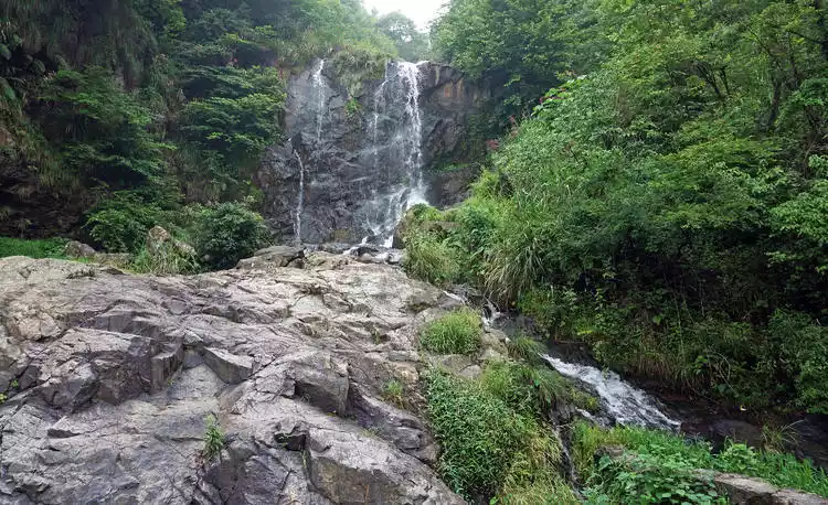 On the way to the top of the mountain, there is a waterfall worth going down to see. If you look closely, you can see two waterfalls pouring down, so this waterfall is called Yu Lian Shuang Fei.
