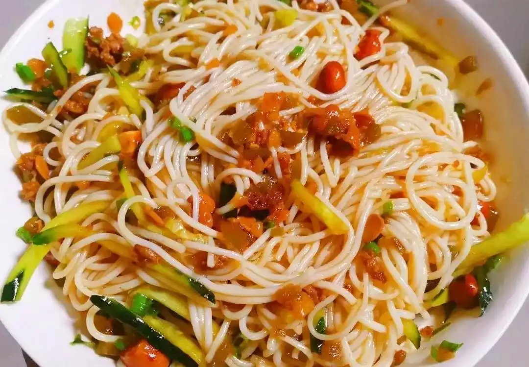 Then pour the homemade sauce over it and add shredded cucumber, kelp, peanuts, bean sprouts, diced radish, cilantro, and other cold side dishes according to your preference. If you can handle spicy food, you can add a spoonful of chopped chili pepper, stir well, and then eat it.