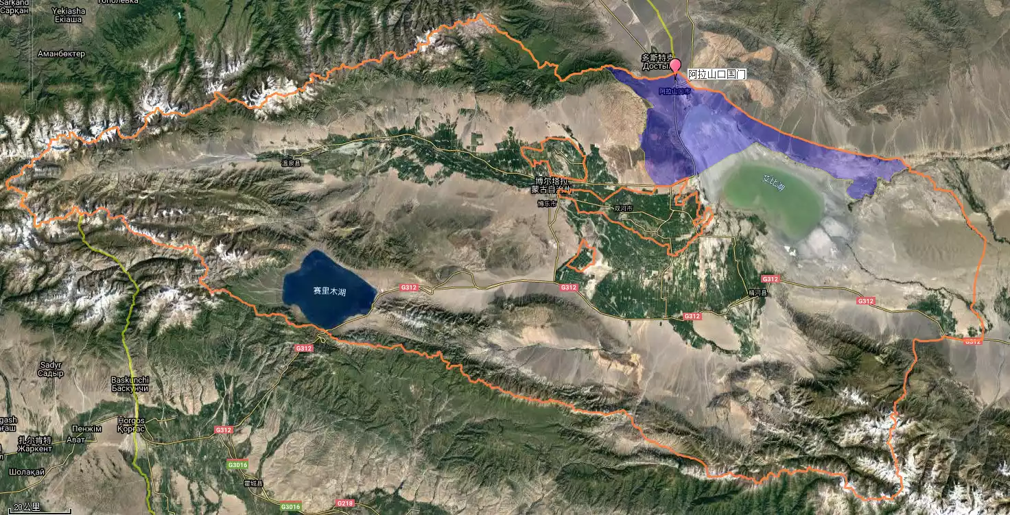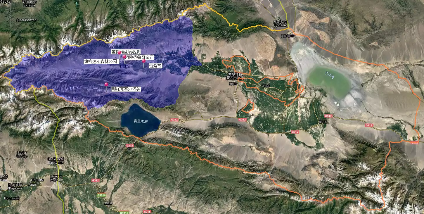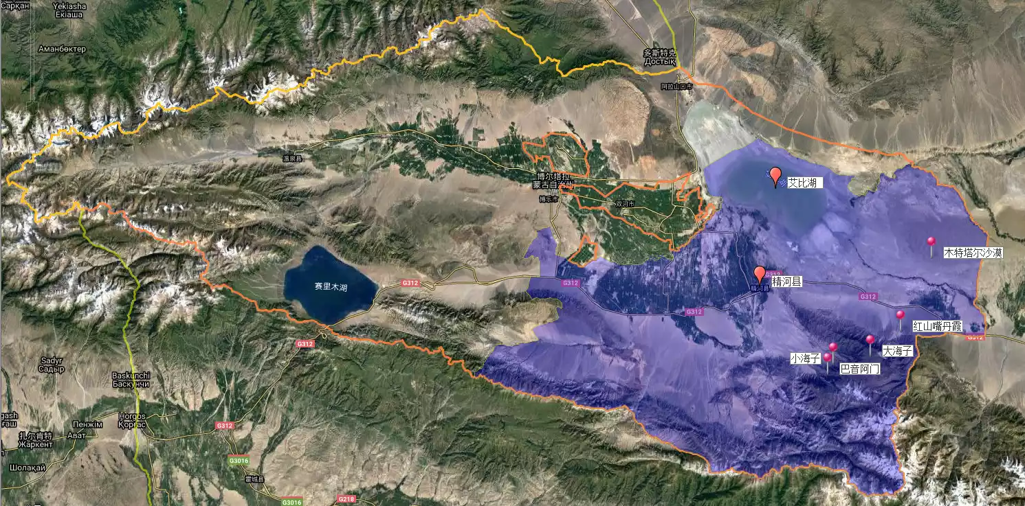 Bortala Mongol Autonomous Prefecture, abbreviated as "Bozhou," means "silver grassland" in Mongolian. As shown on the map below, it is located on the northwestern edge of Xinjiang, at the western end of the Junggar Basin, and features a "two lakes and three mountains" landscape.