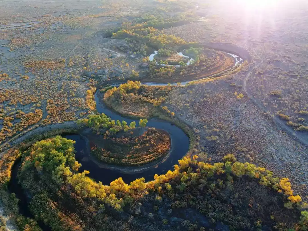 In the "Four Trees River" scenic area within the reserve, the river meanders and dense poplar forests grow on both sides of the riverbed. Looking into the distance, an oasis is added to the yellow desert landscape, showing the wonder of the Gobi oasis, which looks like a green Great Wall from a distance.