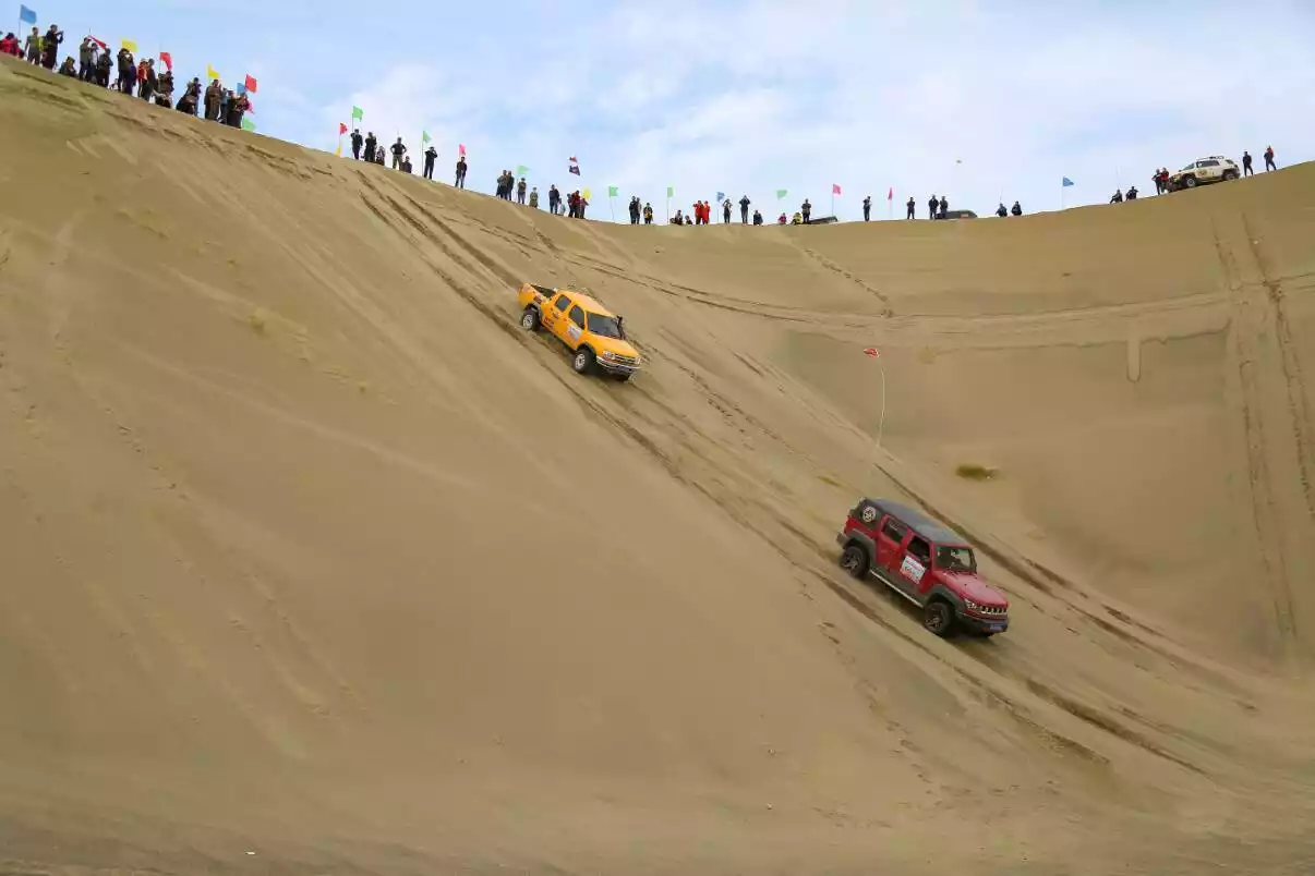 The tall sand dunes have steep slopes and undulations. It is more exciting to drive down a steep slope of 60 to 70 degrees in an off-road vehicle, with two or three sand dunes in a row, than to ride a roller coaster in an amusement park.