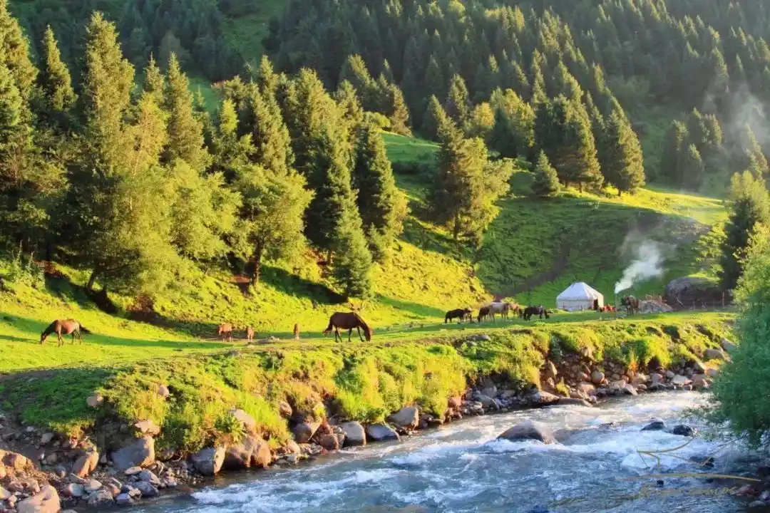 Known locally as the "Little Hot Spring," it is the largest tributary of the Bortala River. Surrounded by mountains and lush vegetation, the valley offers a uniquely tranquil retreat, with the sound of the river, birdsong, and cicadas in the summer. The verdant spruce trees and tender green grass create a uniquely Swiss atmosphere.